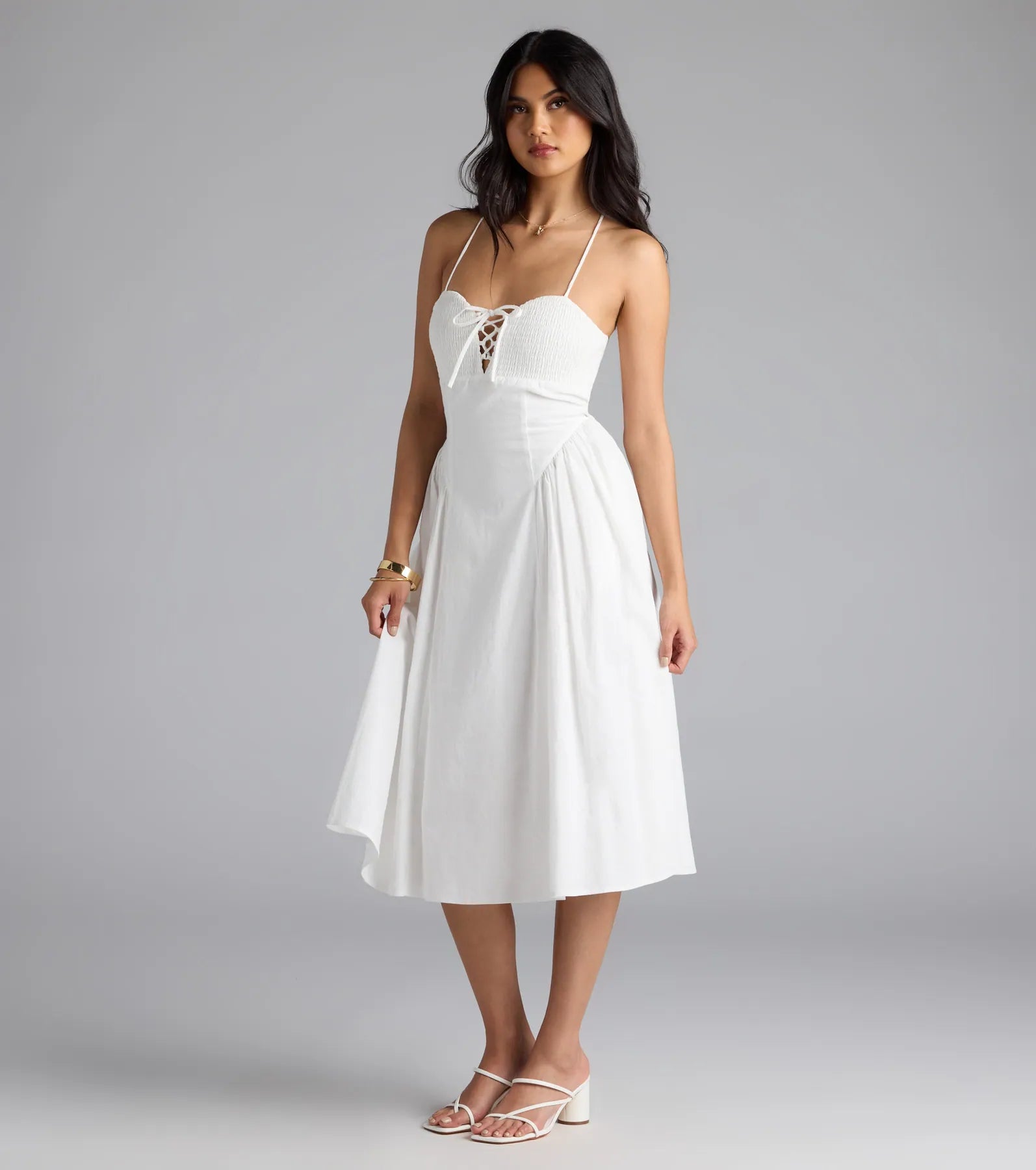 - Sweetheart neckline. lace-up front. stretchy smocked bust