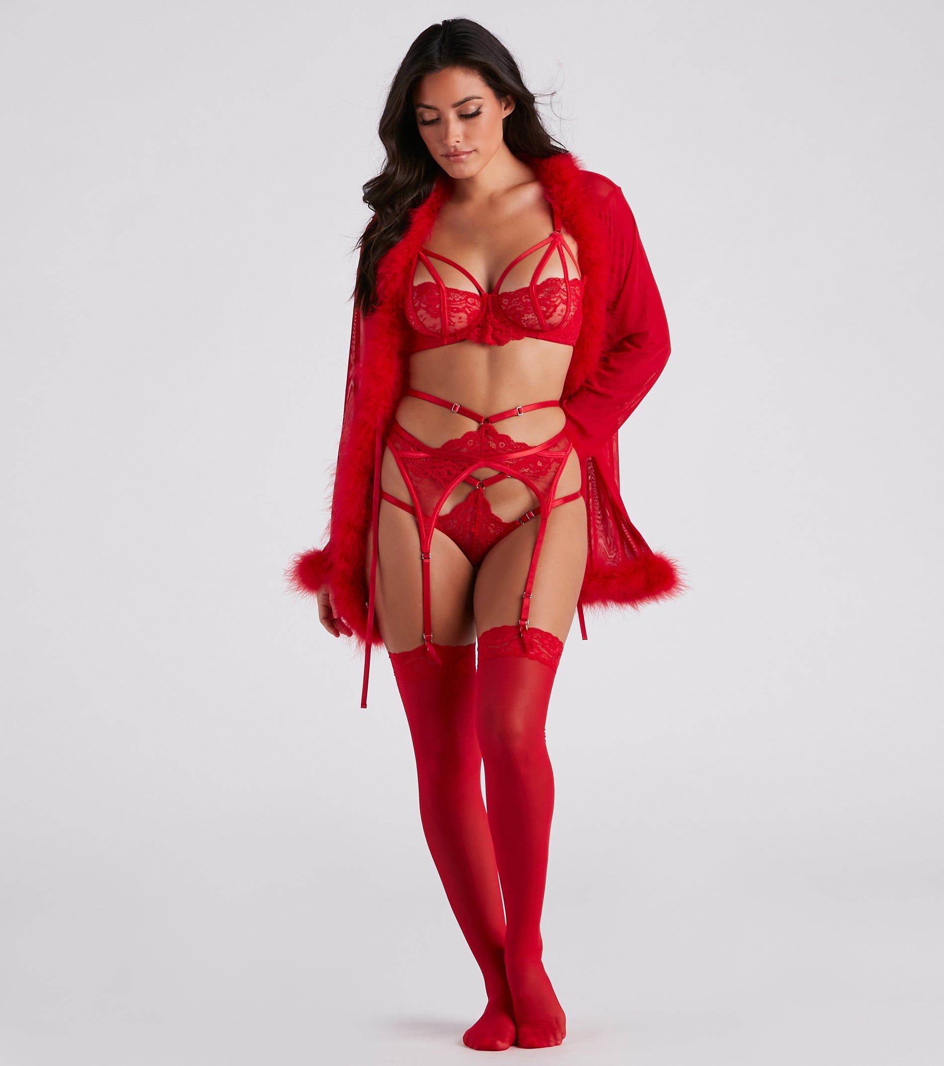 Create an effortlessly enticing look in this sultry sheer lace lingerie set! It features a bra with a caged front strappy design. adjustable spaghetti straps. and gorgeous lace detailing. The matching panty has a high-cut thin strappy design with lace details and a thin thong strap. The lace garter features thin adjustable straps. Style this set with a sexy feather trim robe.