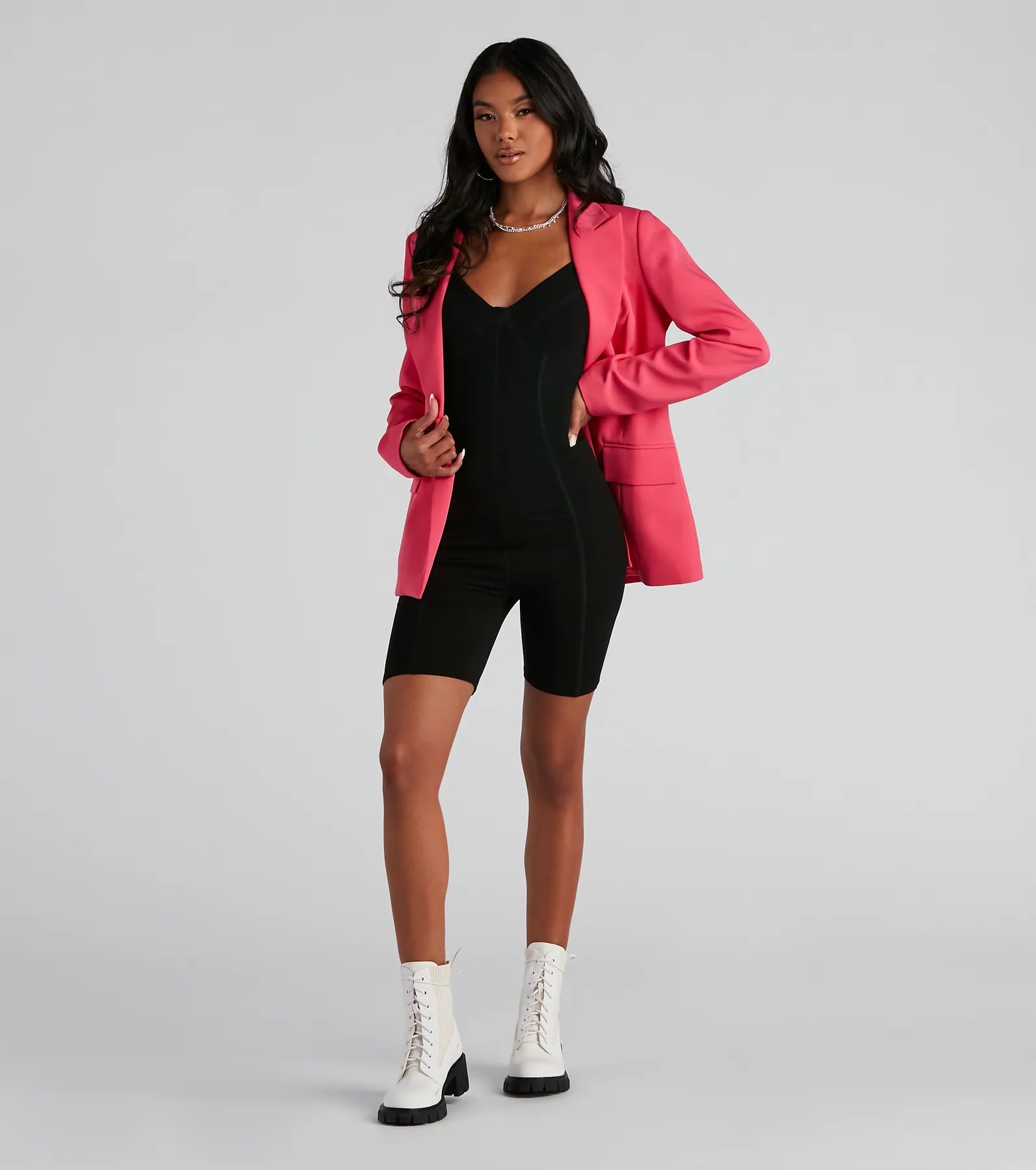 This ribbed knit romper is the perfect elevated basic for casual everyday looks. It features a sleeveless V-neckline. spaghetti straps. a form-hugging fit. a mid-thigh length. and a trendy contrast-stitched design on the front. Style with an and booties.