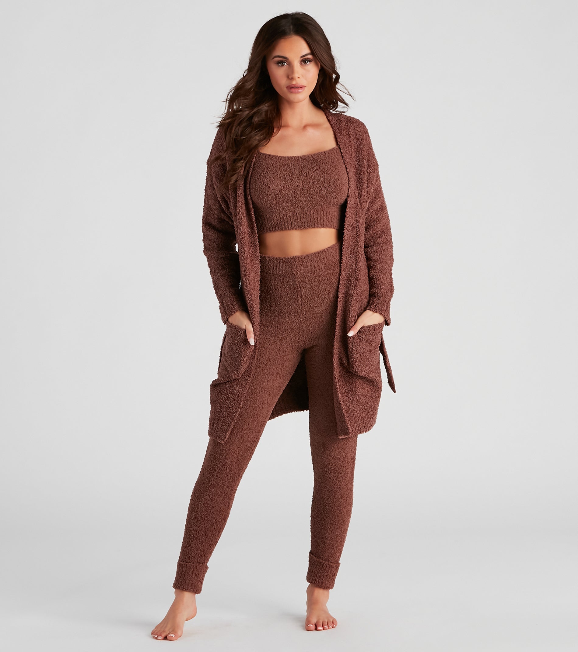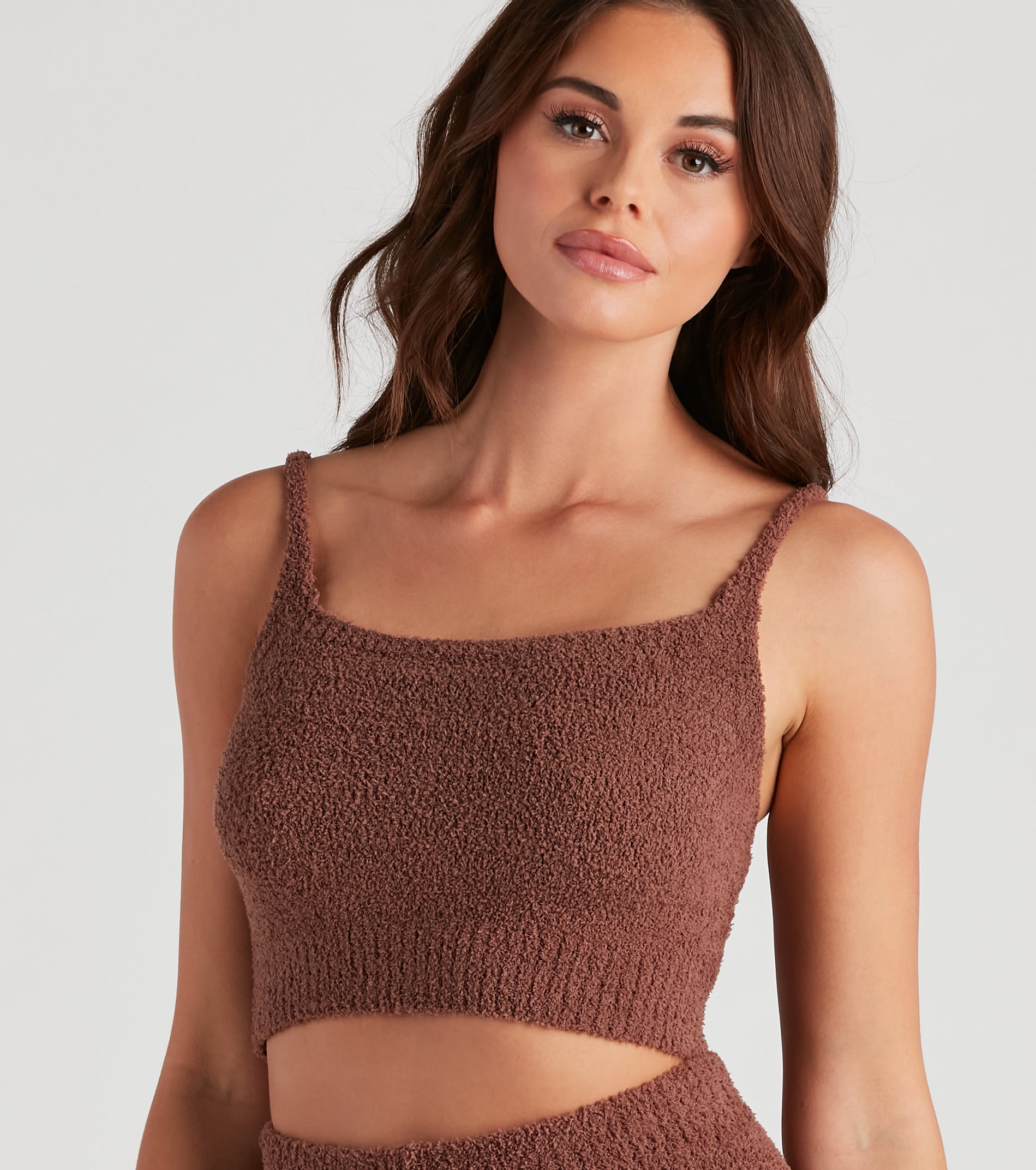 Cozy vibes all around! Snuggle up in this chenille PJ top featuring a sleeveless square neck. spaghetti straps. and a cropped hem. Complete the look with the matching bottoms and robe.??