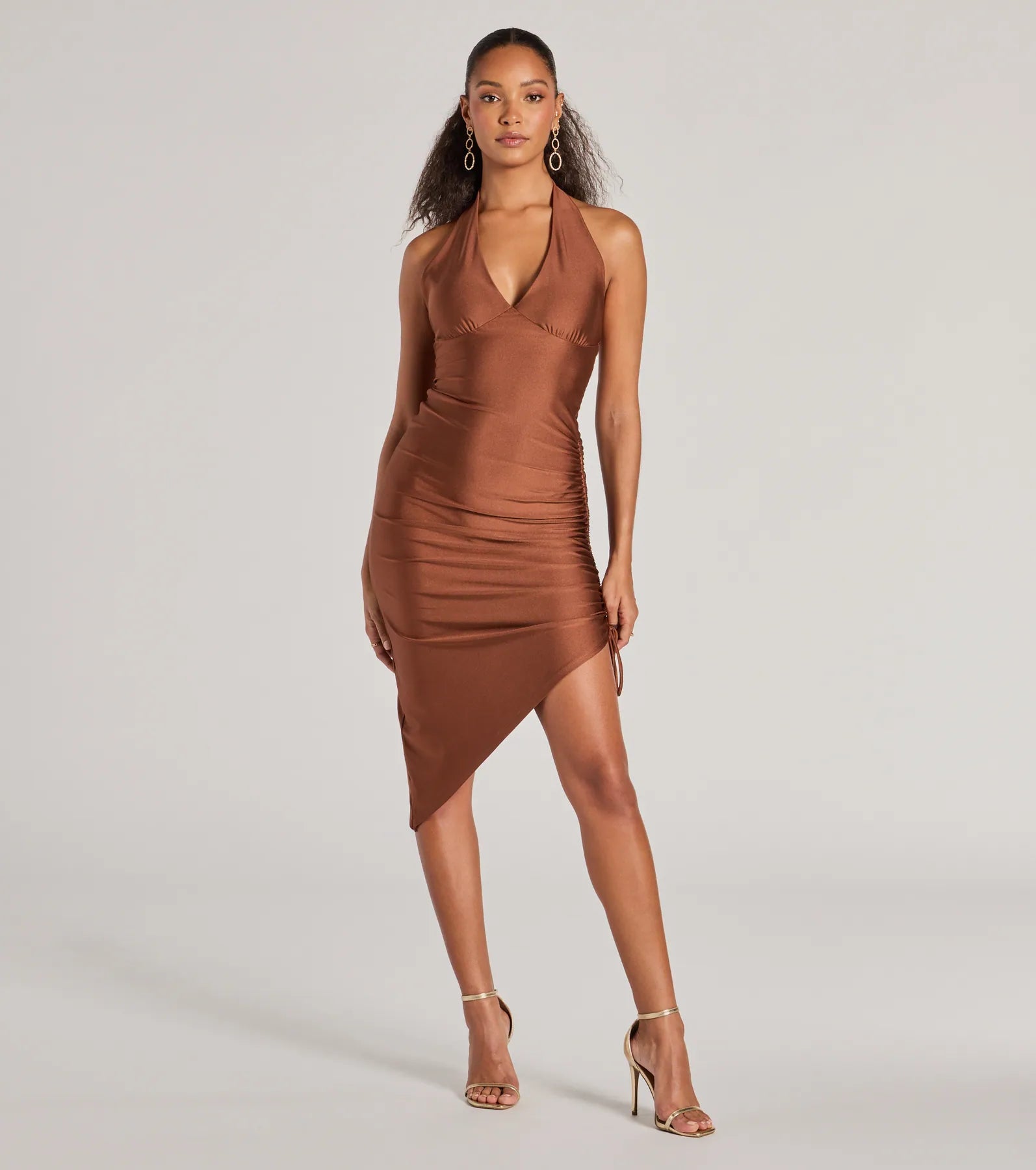 A sultry sleeveless midi dress featuring a V-neck halter neckline and an adjustable side drawstring that highlights your curves along the bodycon fit. The knit fabric effortlessly hugs your body and sleek design.