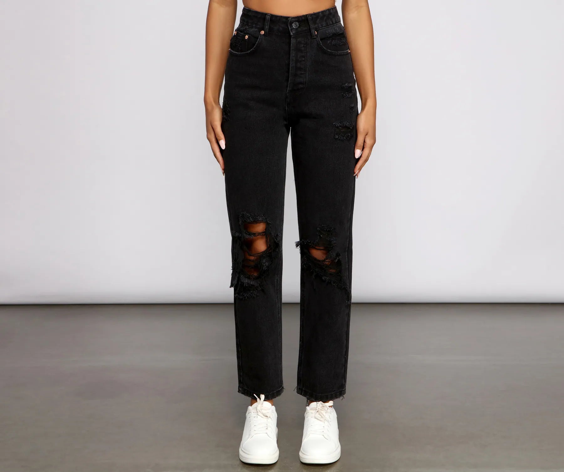 Elevate your style with chic jeans that make your look stand out. The jeans feature a high-rise waist. a multi-button front. a five-pocket design. moderate destruction. and a straight leg with boyfriend fit. Complete the look with a ?