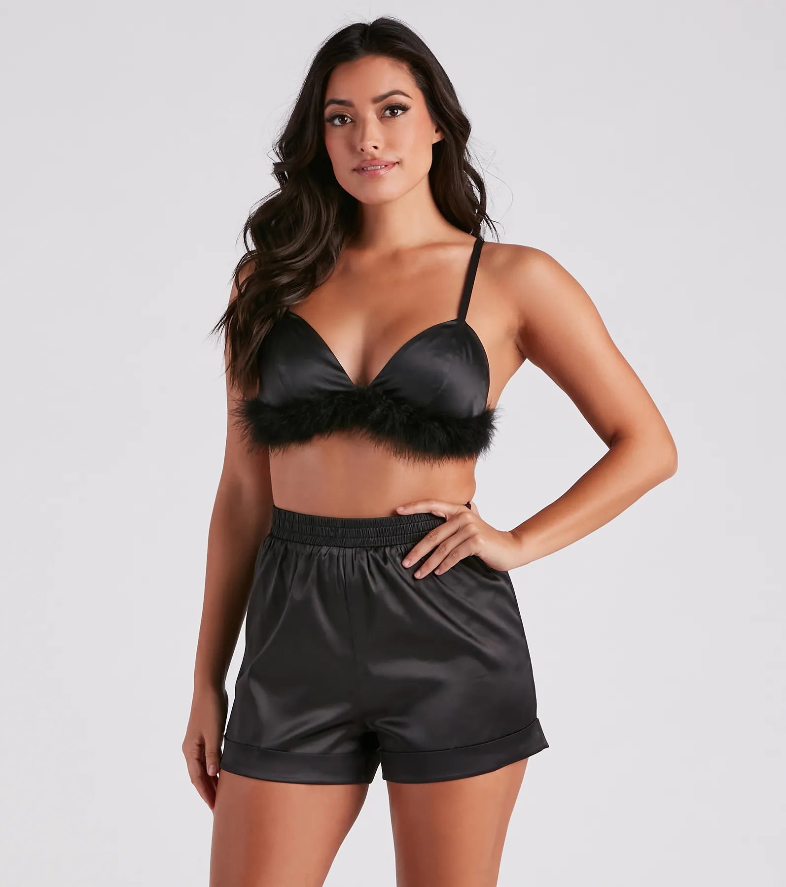 Make them fall head over heels for you in this flirtatious satin pajama set! It features a bra with triangle cups. adjustable spaghetti straps. and a chic marabou feather trim hem. The matching shorts feature a high-rise elastic banded waist and a relaxed fit. The silky satin fabric makes the set all the more luxe and offers a moderate stretch. Style with rhinestone stud earrings.