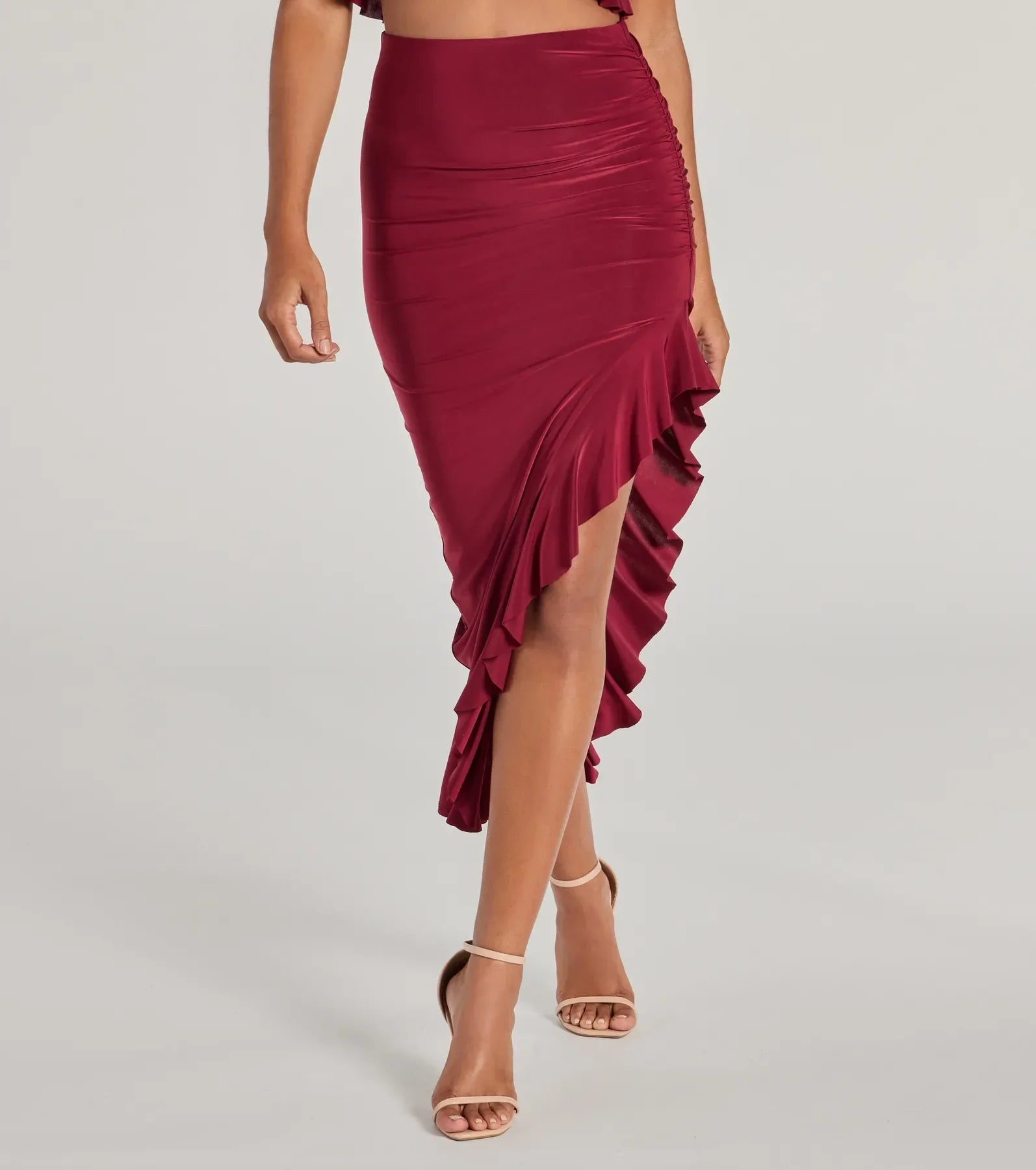 Make major flirty moves and create an enticing aura in this ruffled slit midi skirt! Designed with a stretchy smooth knit fabric. it features a high-rise elasticized waist for comfortable wear. ruching down the side seam to accentuate your curves. a sultry high-cut side slit with a ruffled hem. and a bodycon fit along the midi-length silhouette. Style with the matching crop top for a girl’s night out!