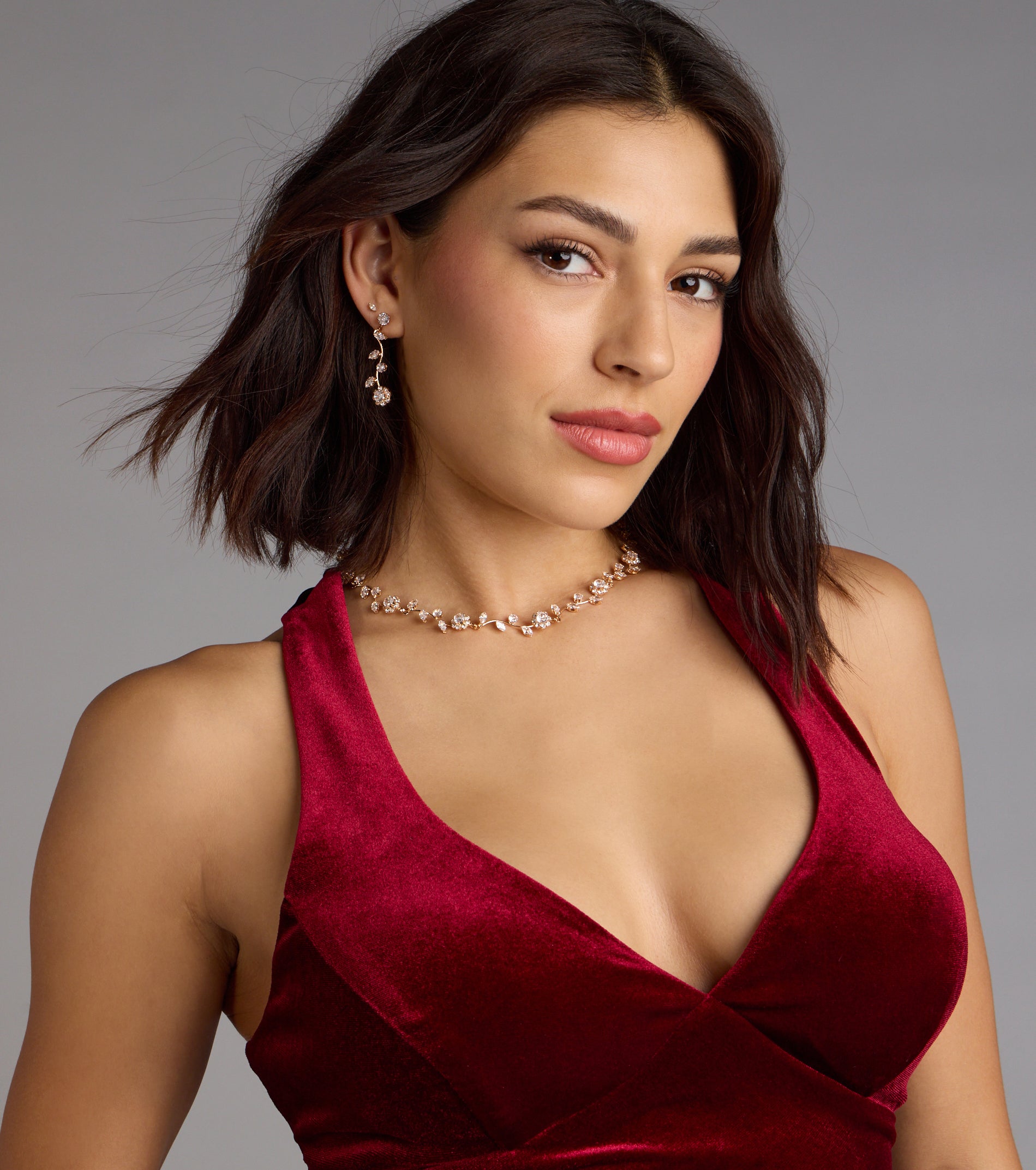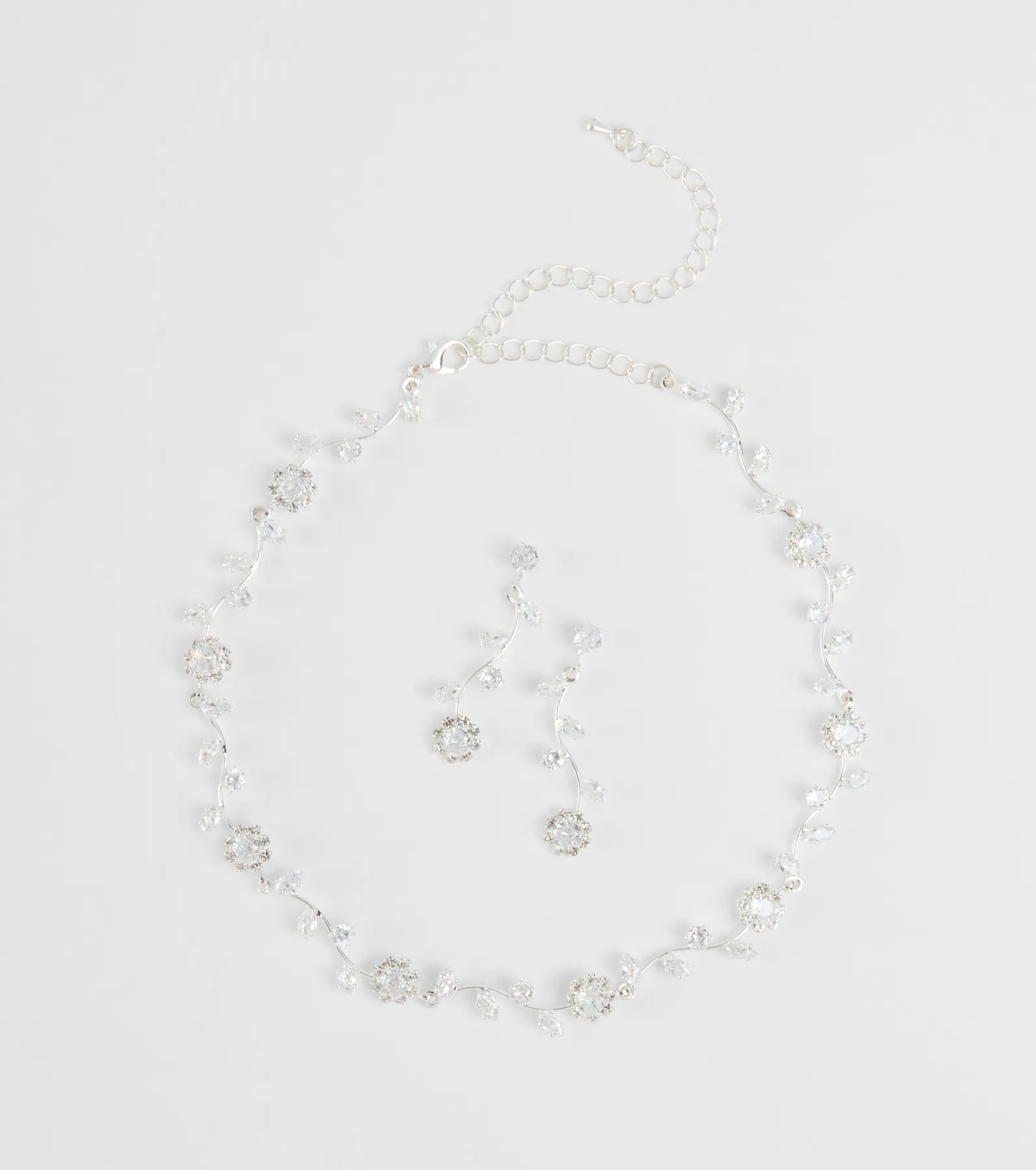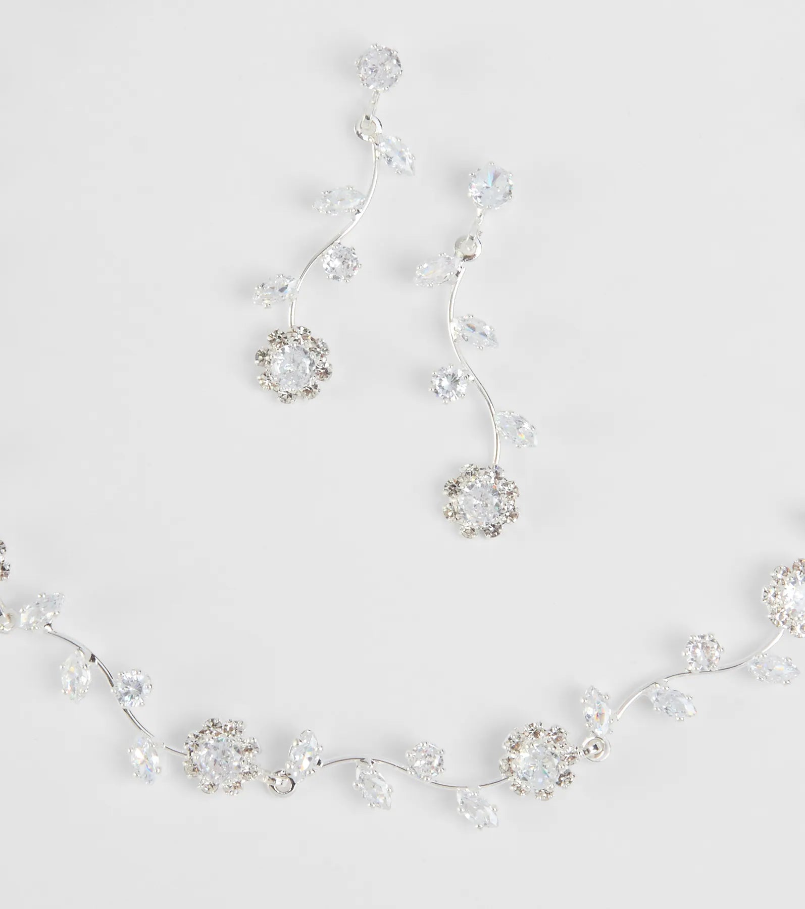A beautiful necklace and earrings set showcasing glamorous cubic zirconia stones in a floral pattern that adds extra sophistication to any formal wear. Pair with a clutch.