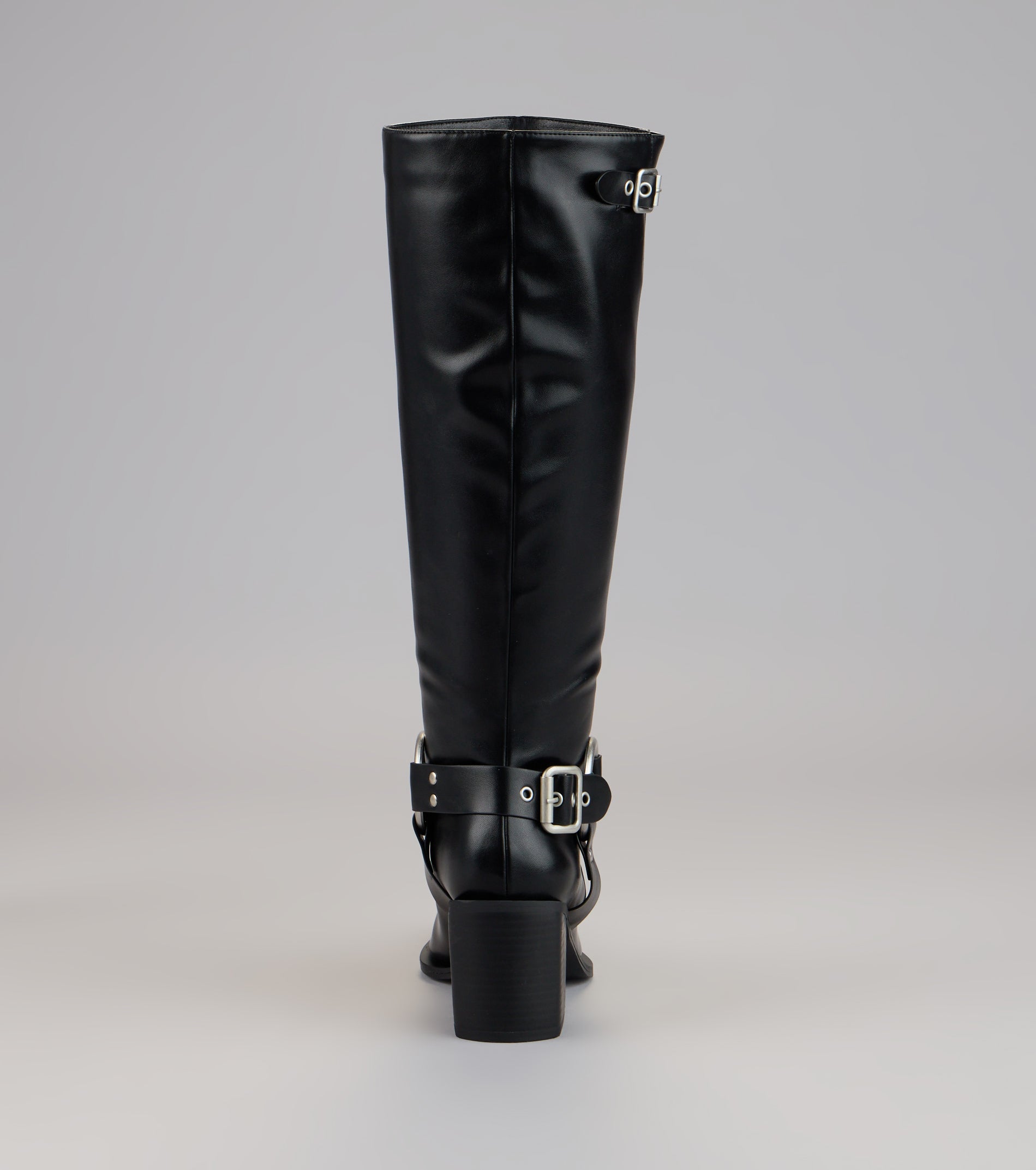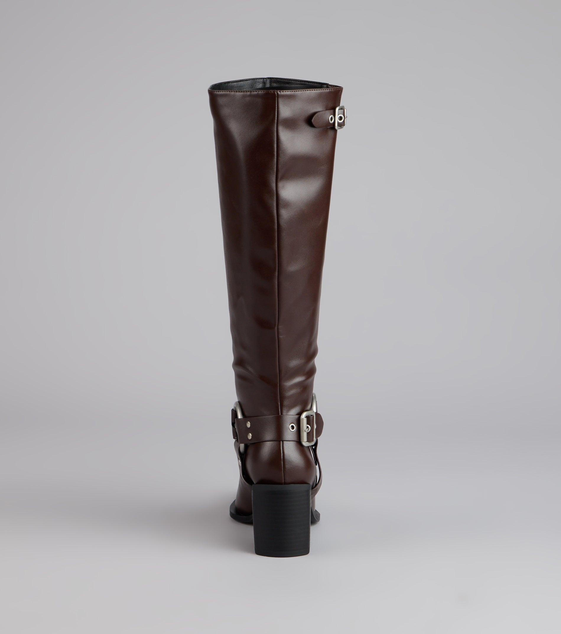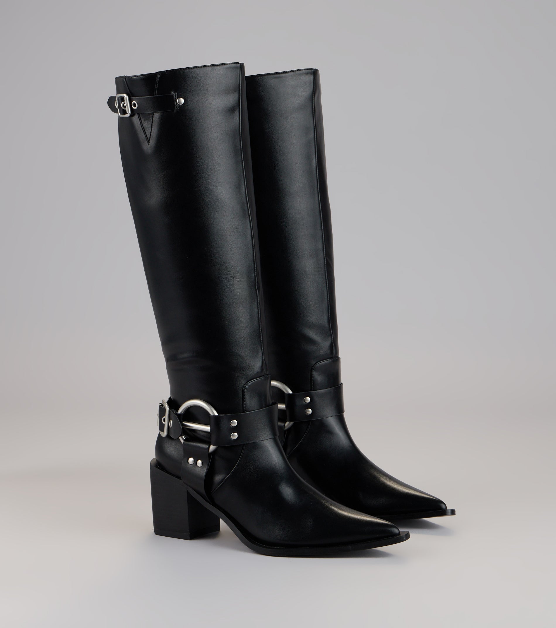 Bring the western energy into your fall lineup with these knee-high boots. Featuring harness buckle detailing. a pointed toe. and a block heel. they bring western flair to a city chic vibe. perfect for styling with any look.