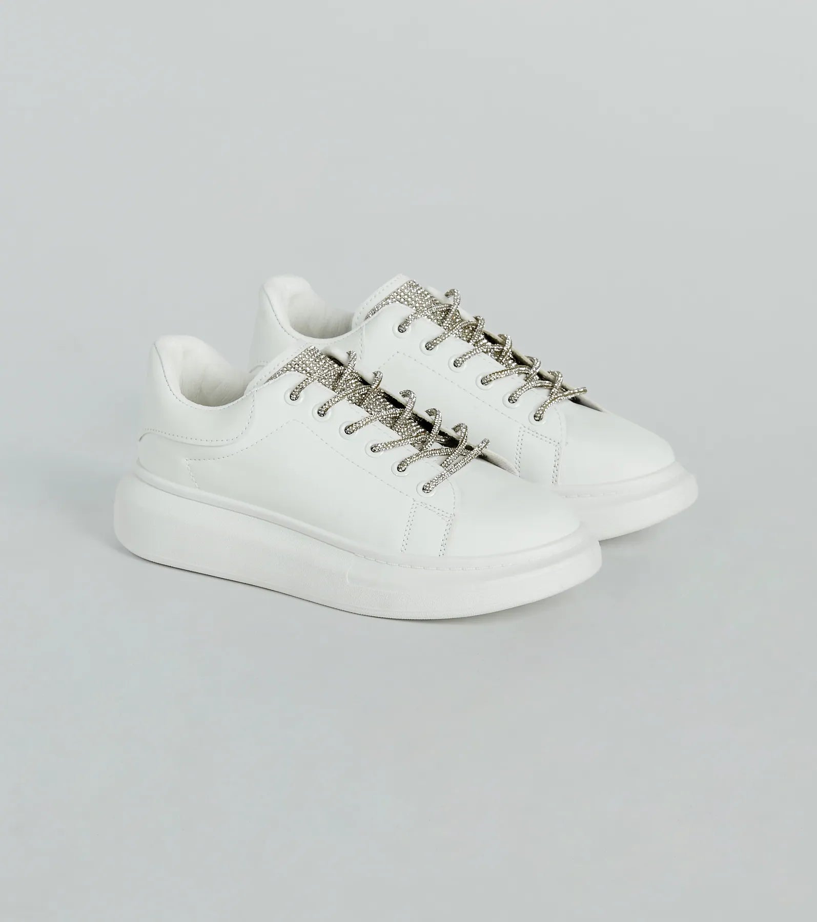 Make any outfit shine in these fashion sneakers! With a round toe. rhinestone embellished lace-up placket and tongue. a platform rubber sole. and a sleek faux leather upper. these sneakers are perfect for stepping out with your glam squad. Complete the look in a to elevate your style for day or night plans!