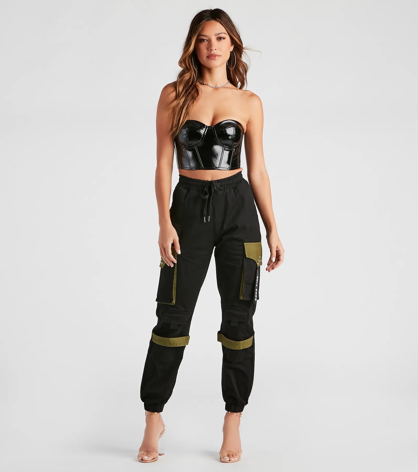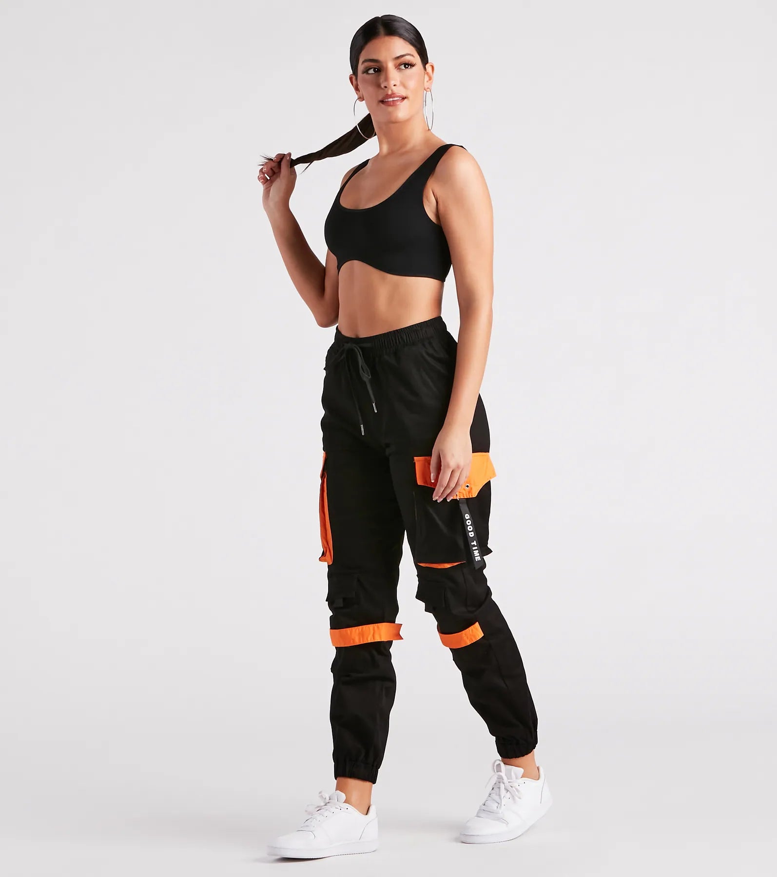 Have a good time exploring in these edgy twill cargo joggers! They feature an elasticized. high-rise drawstring waist. six functional pockets. back faux pockets with snap-button closure. a relaxed fit. and elasticized cuffs. Complete the look in a .