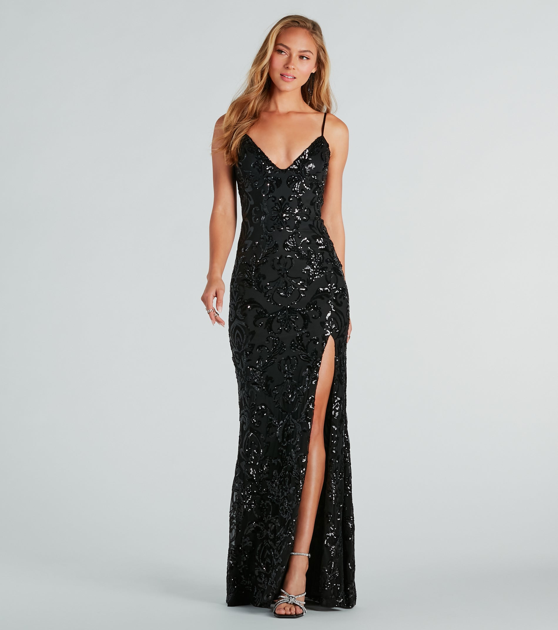 Look like a stylish vision in the Jaqueline formal sequin long dress perfect for sparkling down staircases or making a grand exit! ??span data-mce-fragment=1>Crafted from mesh fabric embellished with an all-over sequin pattern. she features a V-neckline. padded bust. adjustable spaghetti straps. an alluring strappy open back. and a mermaid silhouette boasting a high front slit along her floor-length hem. Perfect for special occasions. this luxe gown ensures sophisticated style! Complete the look with and heels.