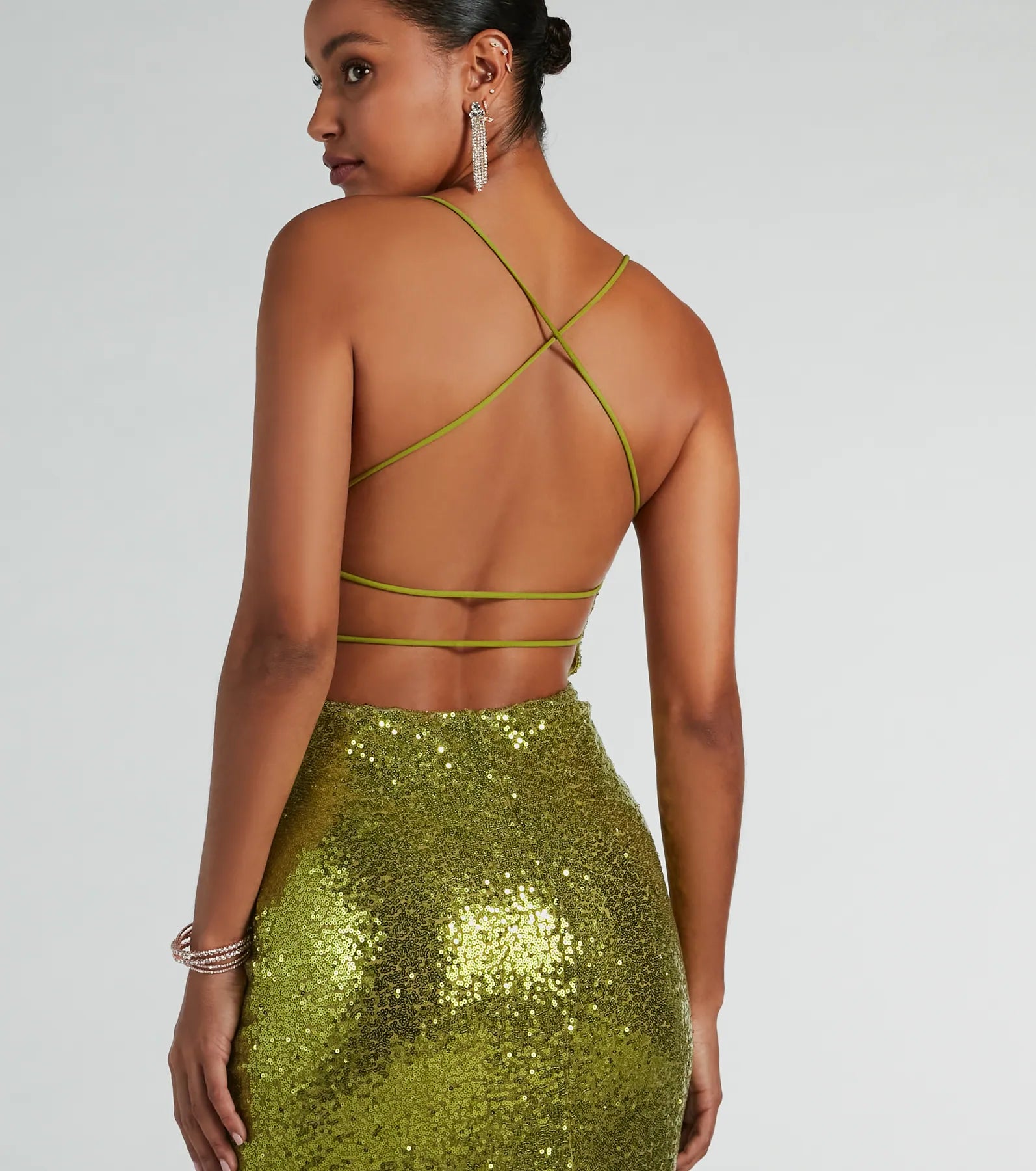 Steal all the glances as you strut into your formal affair in the iconic Jennifer strappy back high slit sequin dress! Crafted with all-over glitzy sequin embroidery on mesh fabric. this fabulous formal dress will have you radiating major glam energy. Her sleeveless bodice is shaped with a chic draped cowl neckline and spaghetti straps that lead to her bold open back with a sultry cross-back strappy design. Her asymmetric high side slit will showcase some skin along her floor-length slim-fit silhouette. Complete your look with .