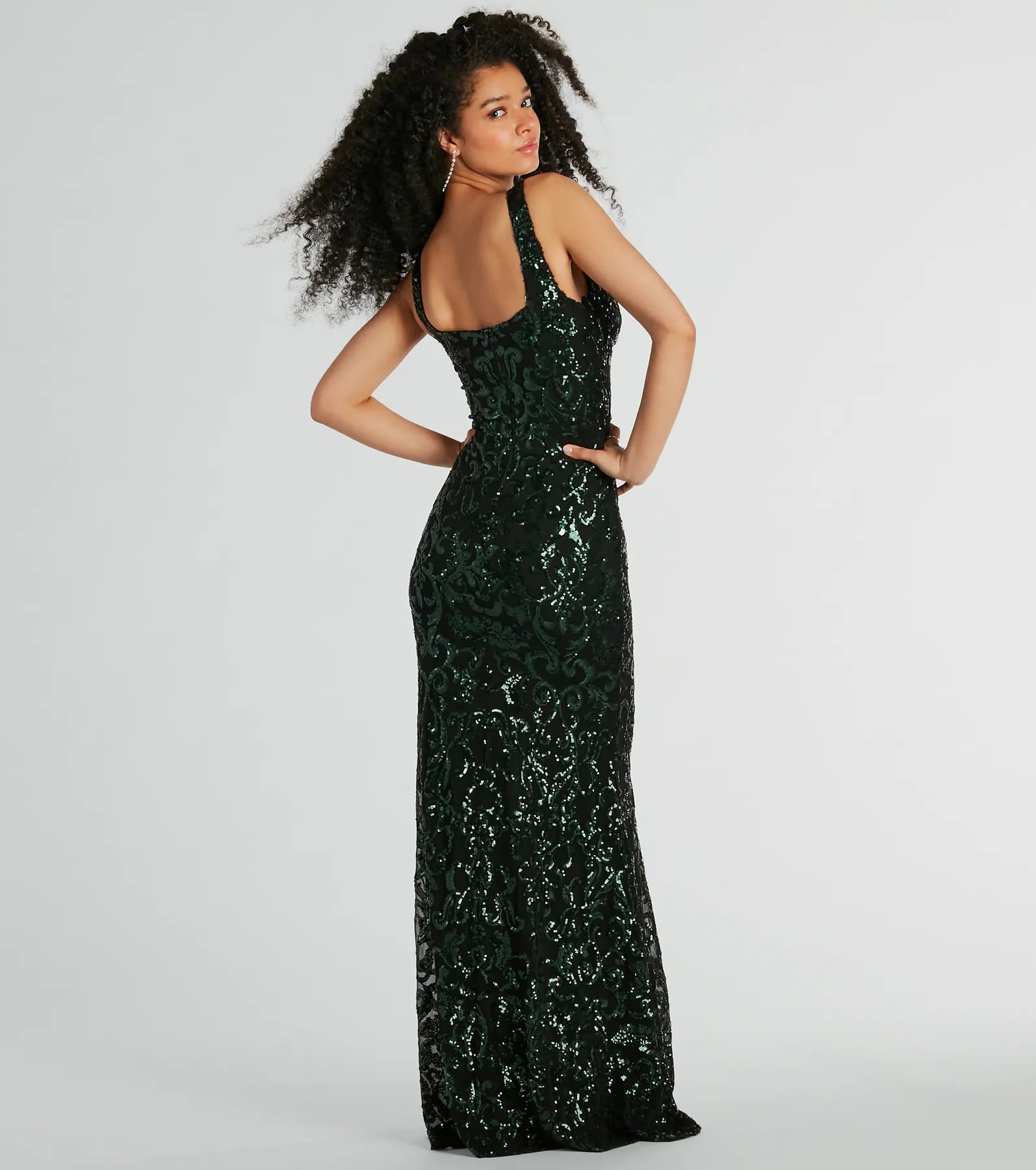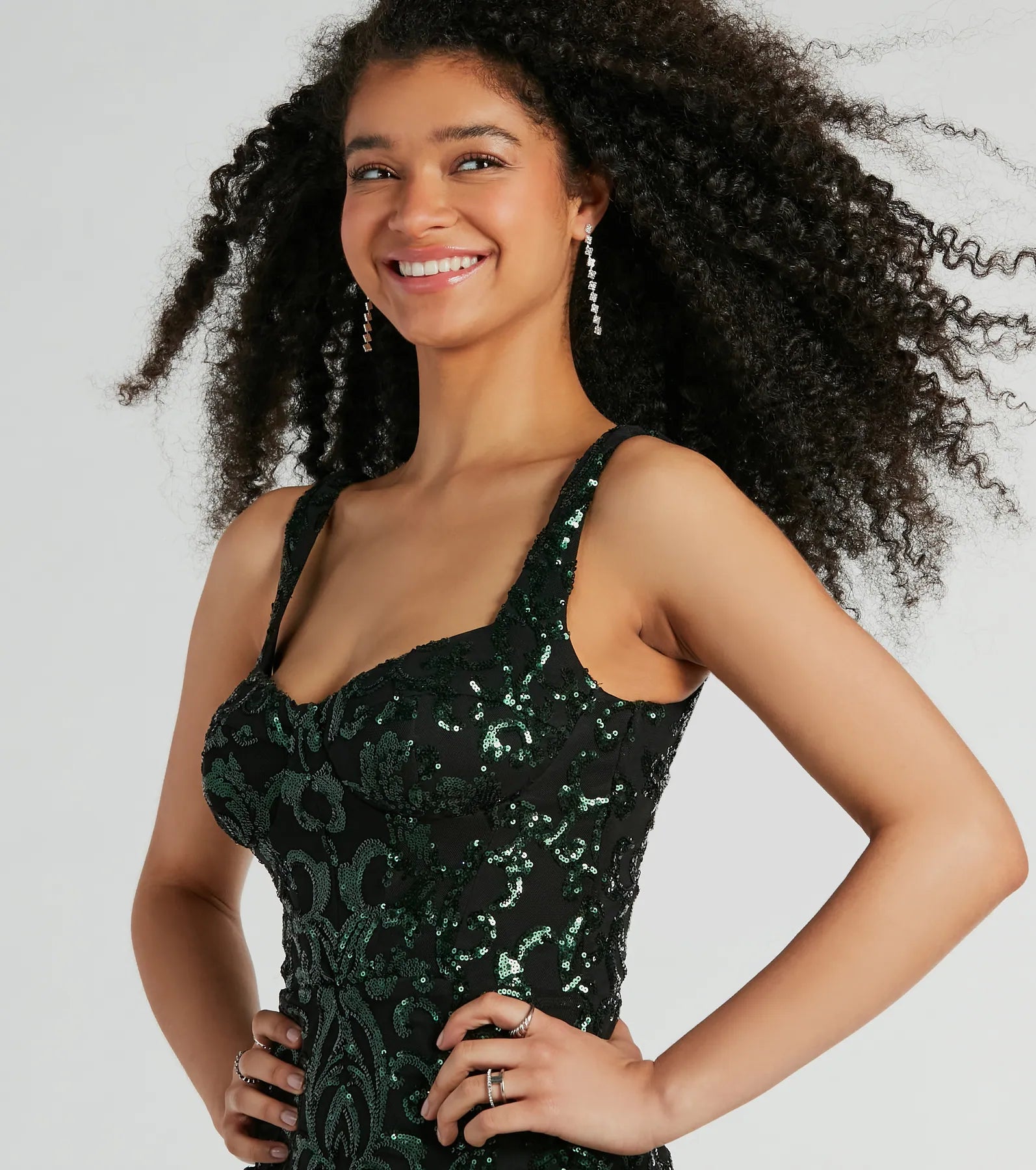 The Karli formal sequin long dress catches the light just right making way for a glamorous night at the school dance or a black tie party! She features a sweetheart neckline. wide shoulder straps. a padded bust for support. and a flattering mermaid silhouette boasting a sexy high front slit along the floor-length hem. The formal maxi dress stuns in a captivating sequin-scroll embellished pattern on mesh fabric and has a full stretchy knit lining. Complete the look with teardrop .