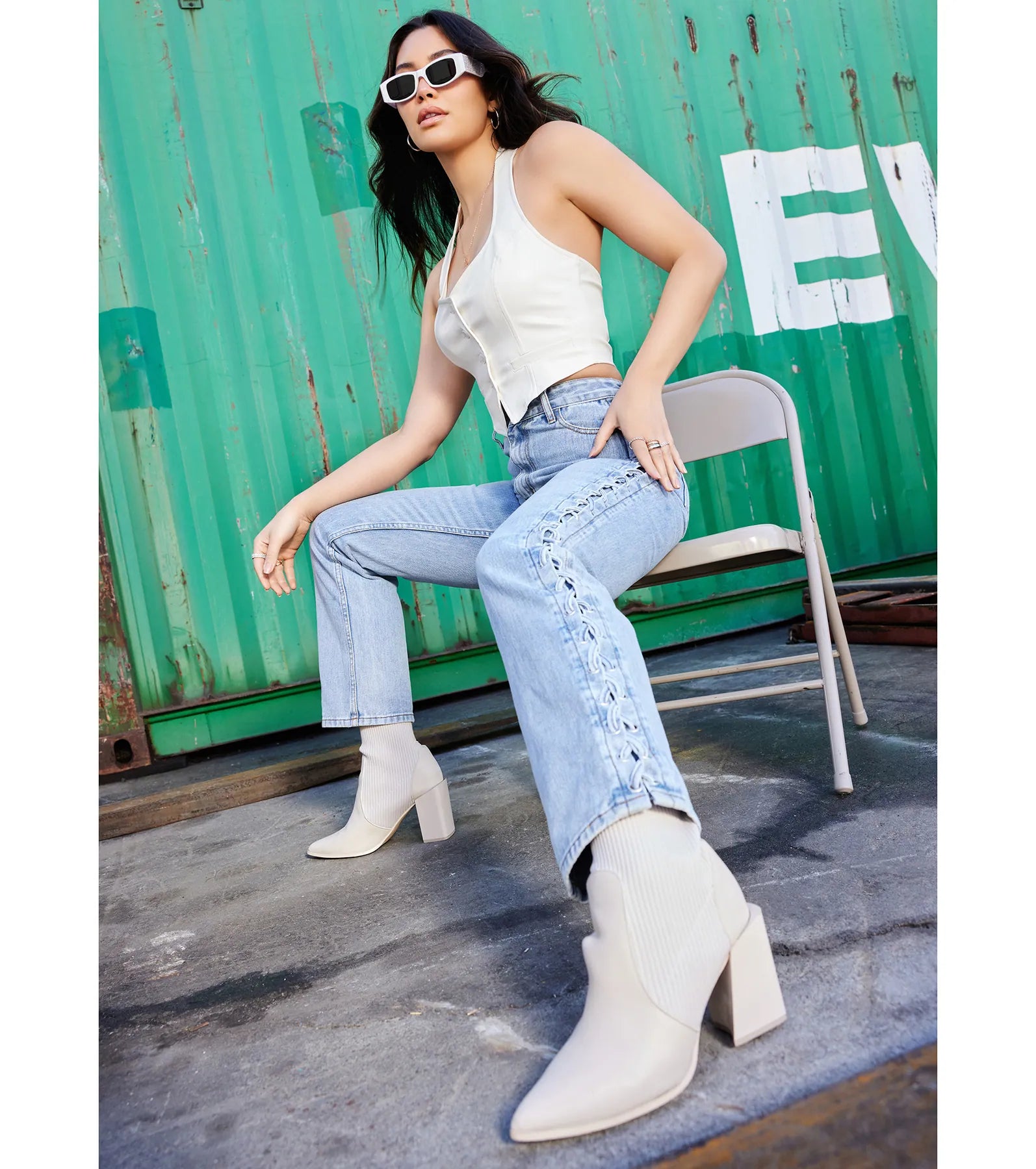 Show off a major slay in this sleek and edgy faux leather cropped vest! It features a sleeveless square neckline. halter straps. a partially open back. a button-down front. and a fitted. cropped hem. The smooth faux leather fabric gives off a chic sheen. Complete the look with the matching wide-leg pants and strappy stiletto heels.