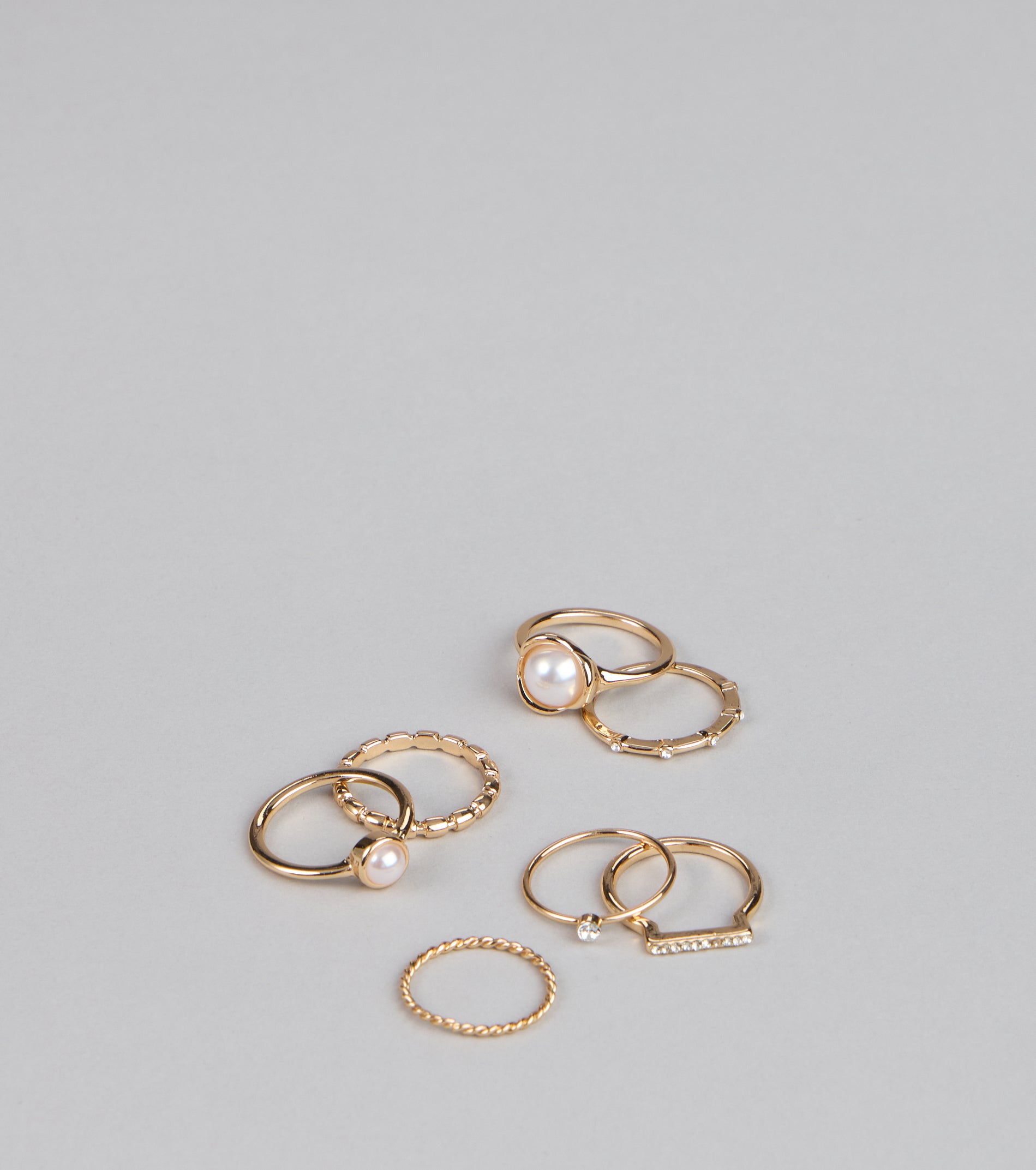 Delicate. polished. and perfectly stackable. This seven-pack ring set features a mix of sleek bands. dainty gems. and lustrous faux pearls that instantly elevate any outfit.