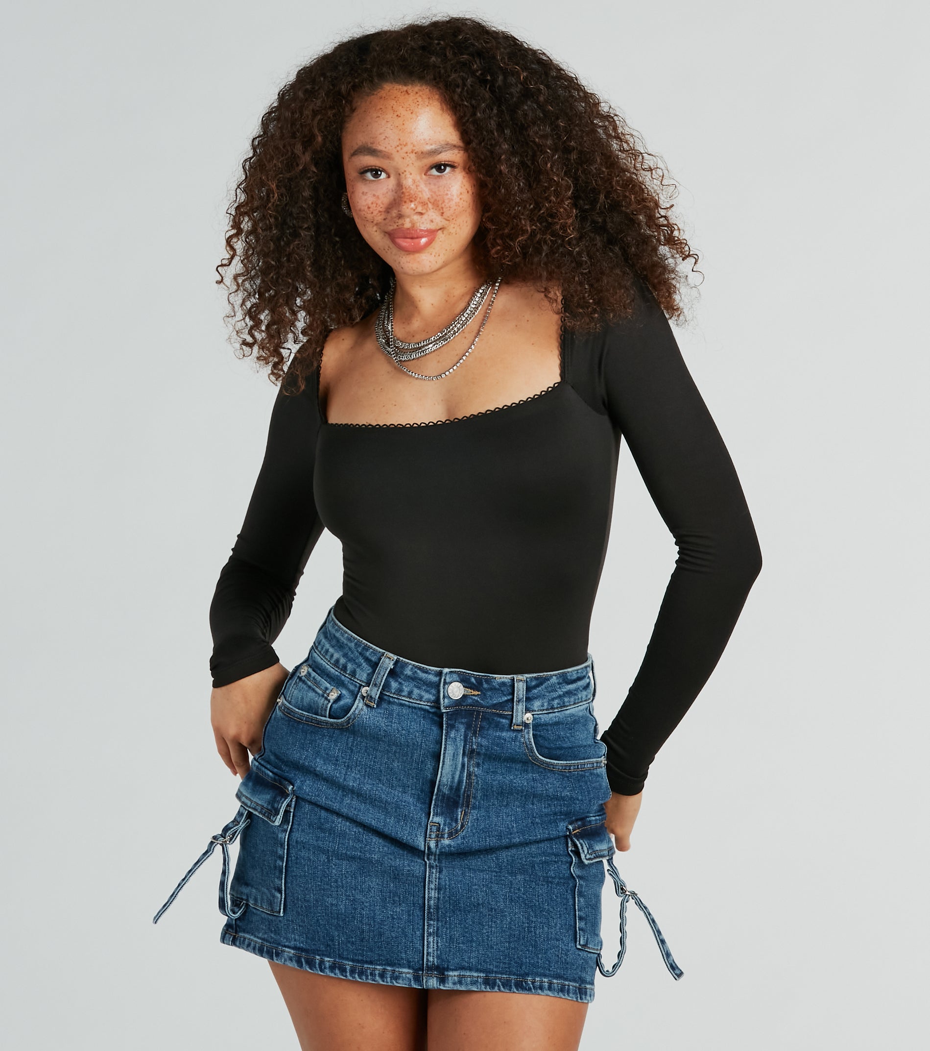 This elevated basic long sleeve bodysuit will become a new fave and staple in your closet. Designed with a stretchy double-lined brushed knit fabric. this bodysuit features a square neckline with a cute dainty scalloped trim. long fitted sleeves. a cheeky bottom with a snap button closure. and a form-hugging fit. Style with and strappy mules.
