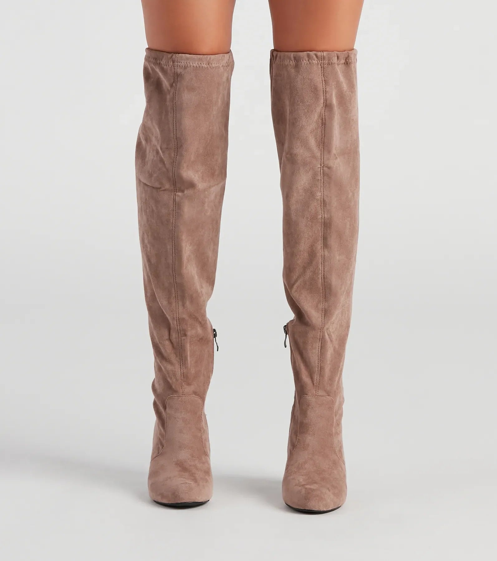 Take your style to new heights in these over-the-knee boots featuring an almond toe. thin block heel. side zipper closure. and a tie-back customizable drawstring on faux suede material. Complete the look in a