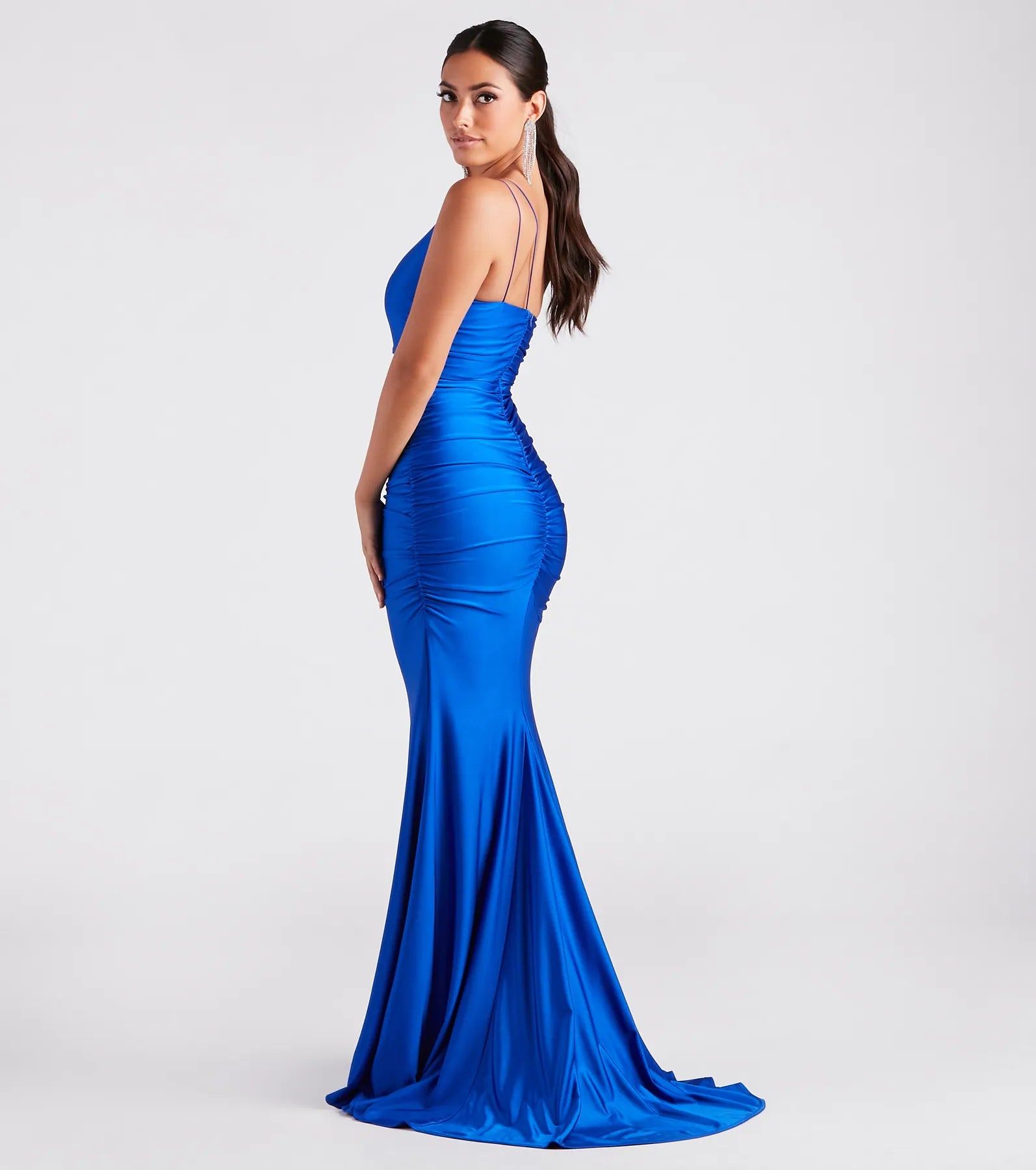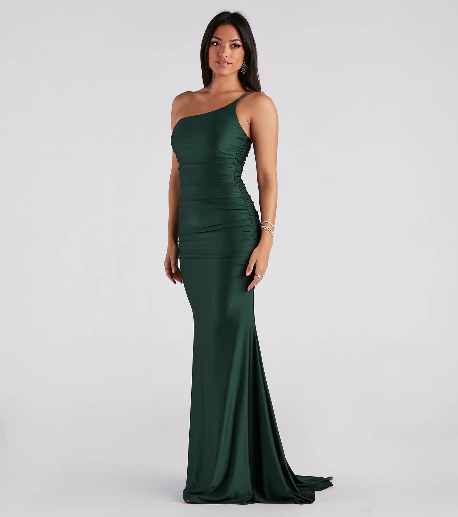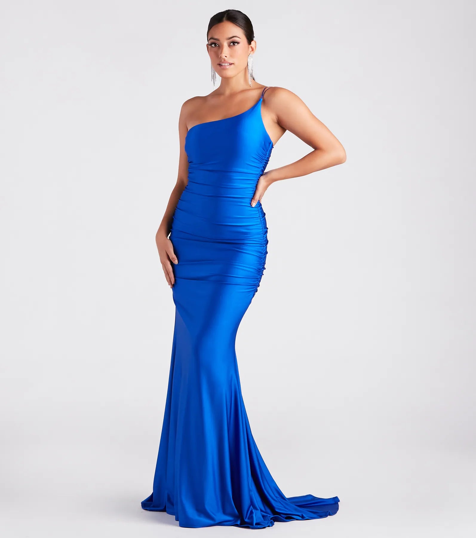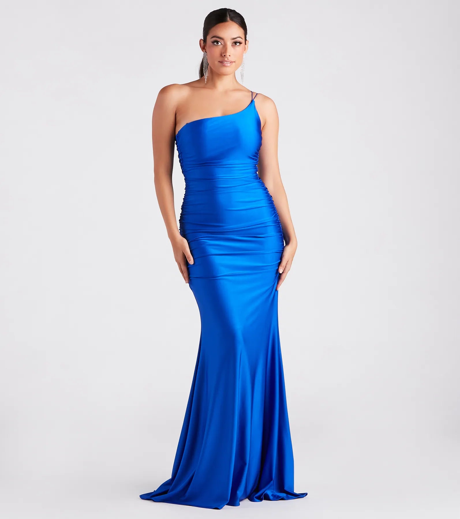 Flaunt your figure in the sophisticated and sultry Nicole formal dress as a stunning bridesmaid. wedding guest. or at a black tie event! She features a sleeveless one-shoulder neckline. a padded bust. dual bungee spaghetti straps. and side and back ruched seams to accentuate your curves along her flattering mermaid silhouette with a floor-length hem. The long dress is composed of a sleek knit fabric with a sewn-in lining and plenty of stretch. Complete the look with a dainty .