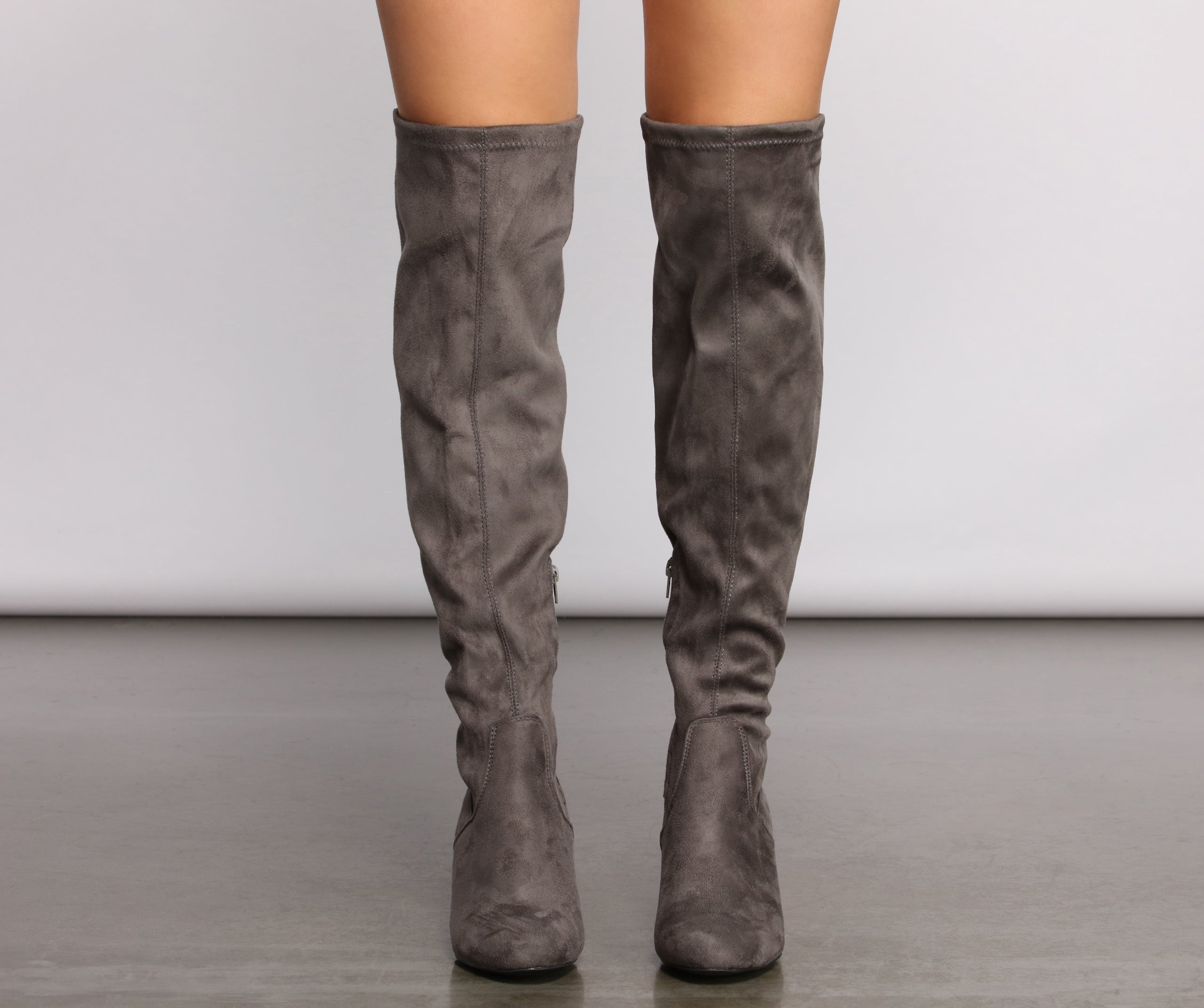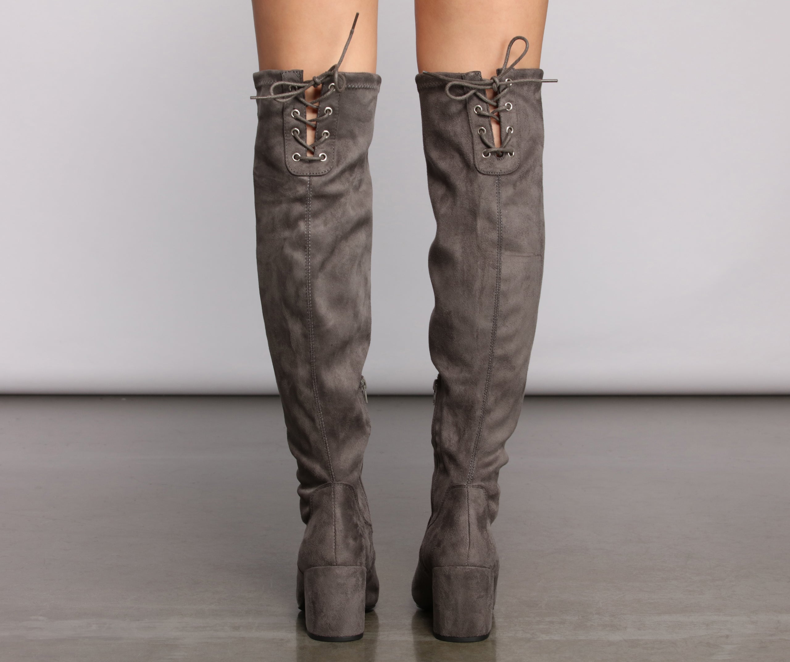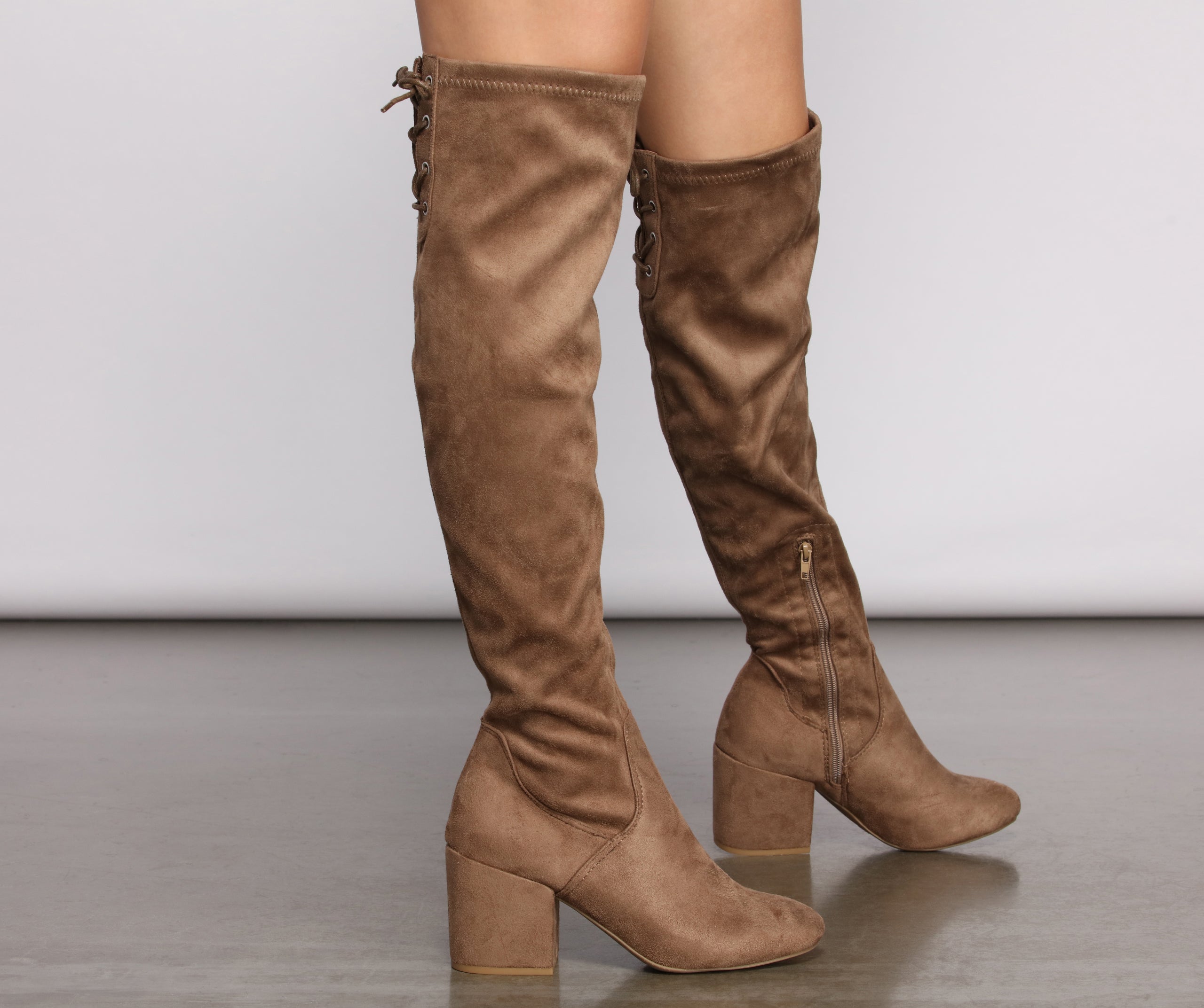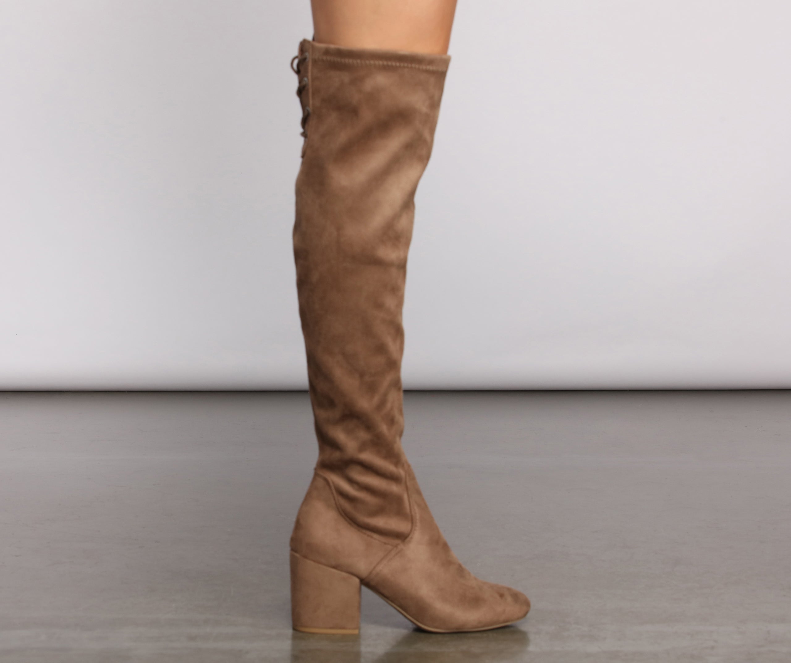 These chic over the knee heeled boots will give you that perfect winter ‘fit you’ve been lusting after! They feature a trendy tie back design and smooth faux suede fabric. Style these with some for an adorable everyday look.