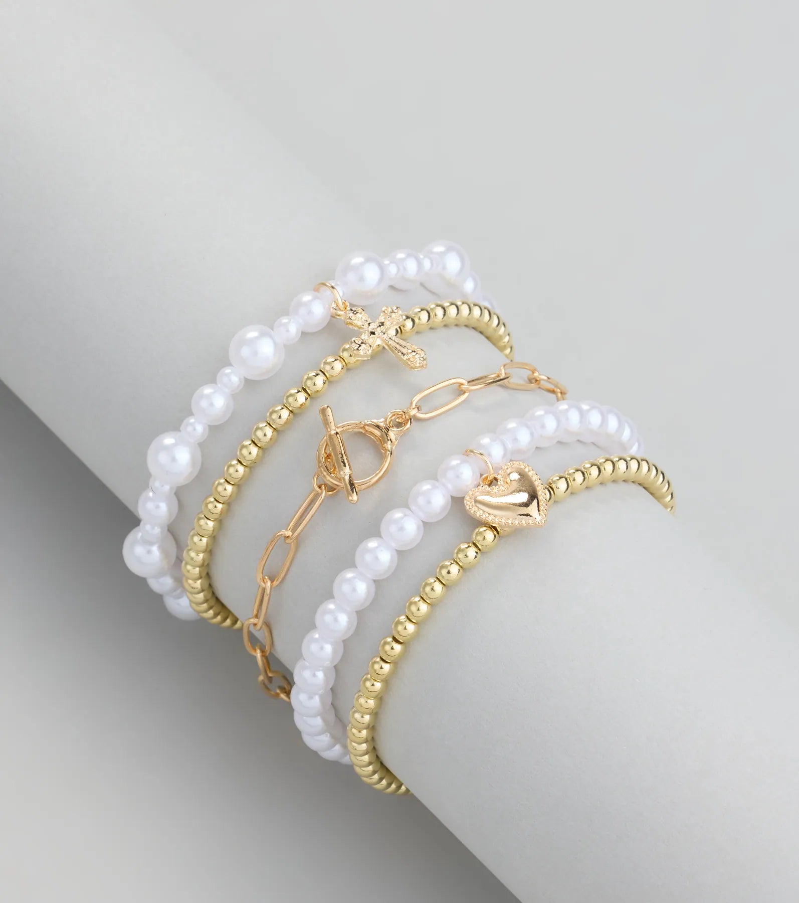 This five-pack bracelet set is an effortless arm stack that features cute heart and cross charms for a playful touch to your favorite looks!