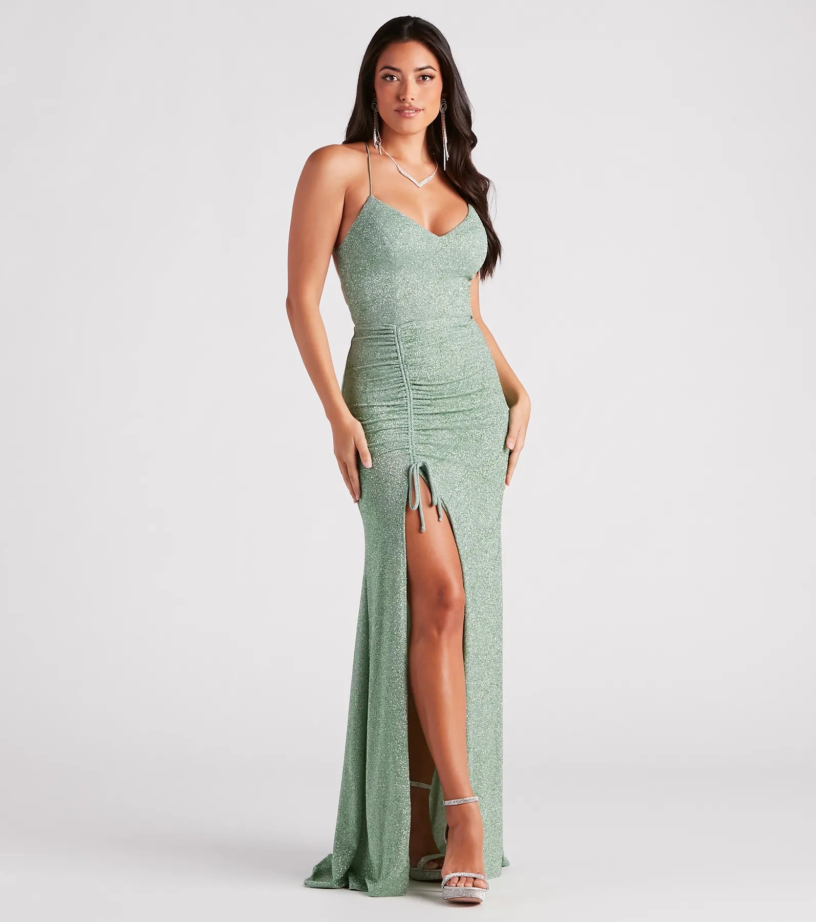 Create a stunning spark in the gorgeous Raina glitter knit mermaid dress at prom. weddings. or fancy parties! She features a sleeveless V-neckline with a built-in padded bust. bungee spaghetti straps. an open back with a cross-back strappy design. a hip-hugging fit. stylish ruching with an adjustable drawstring. a floor-sweeping hem with a short cascading train. a chic front slit. and a mermaid silhouette. The semi-sheer glitter knit fabric includes a mini-length lining. Complete the look in this formal long dress with .