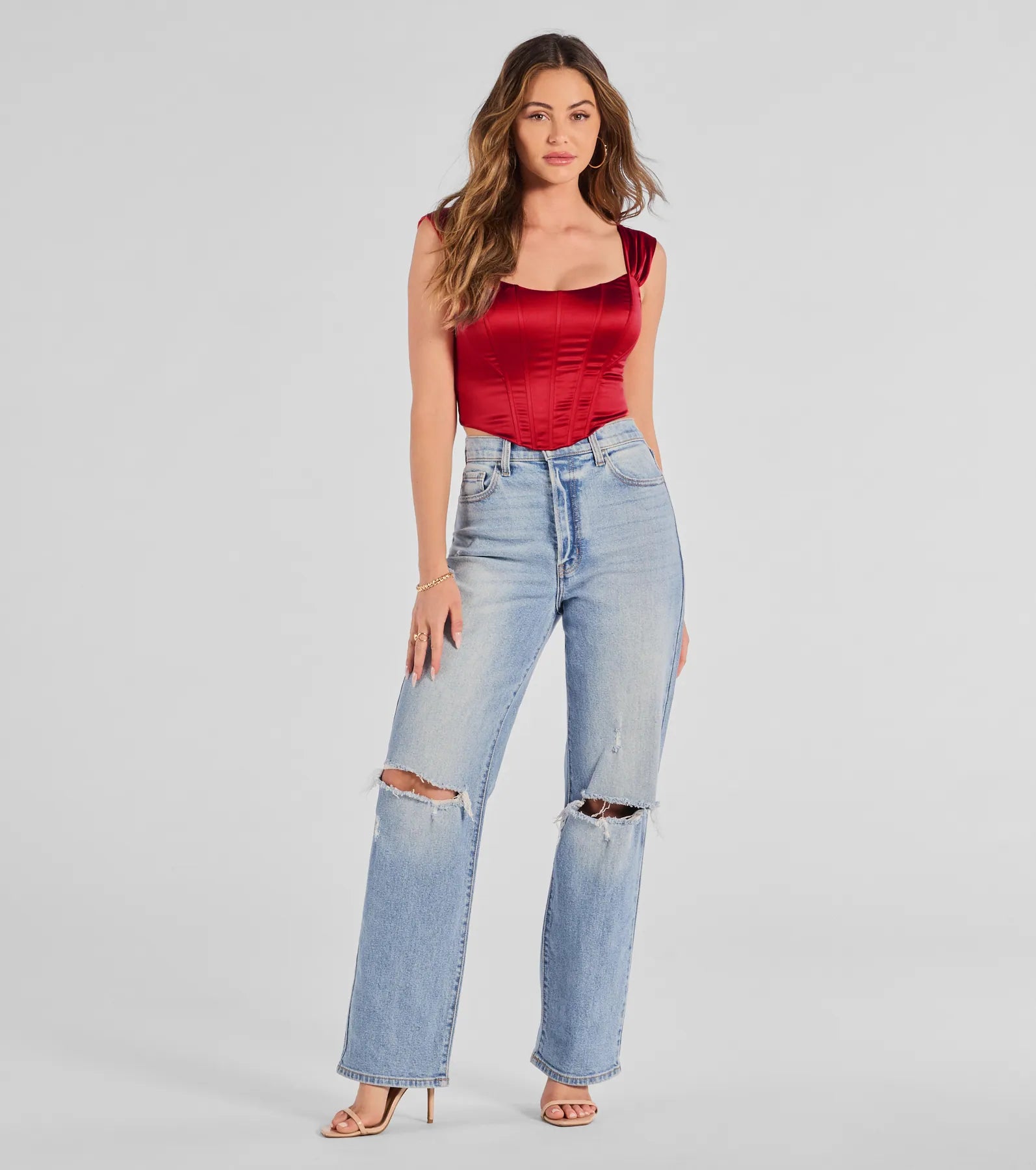 Transform into a captivating beauty in this satin corset top perfect for dressing up for parties or dates! The sleeveless square neckline and wide shoulder straps accentuate your figure. while the flexible boning provides support. The cropped hem and lace-up back add a touch of allure. all crafted from luxurious satin fabric. Complete the look in a sultry .