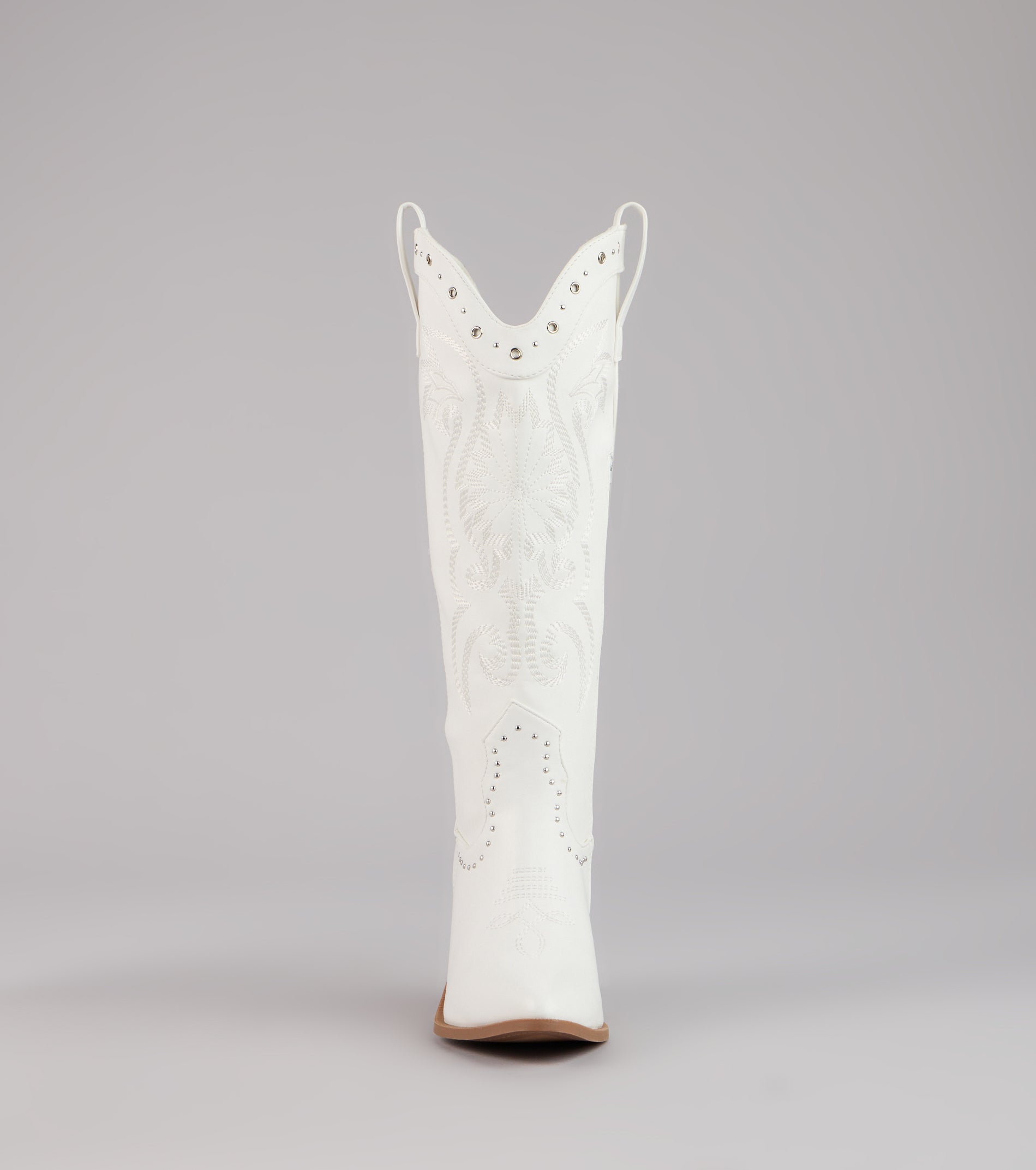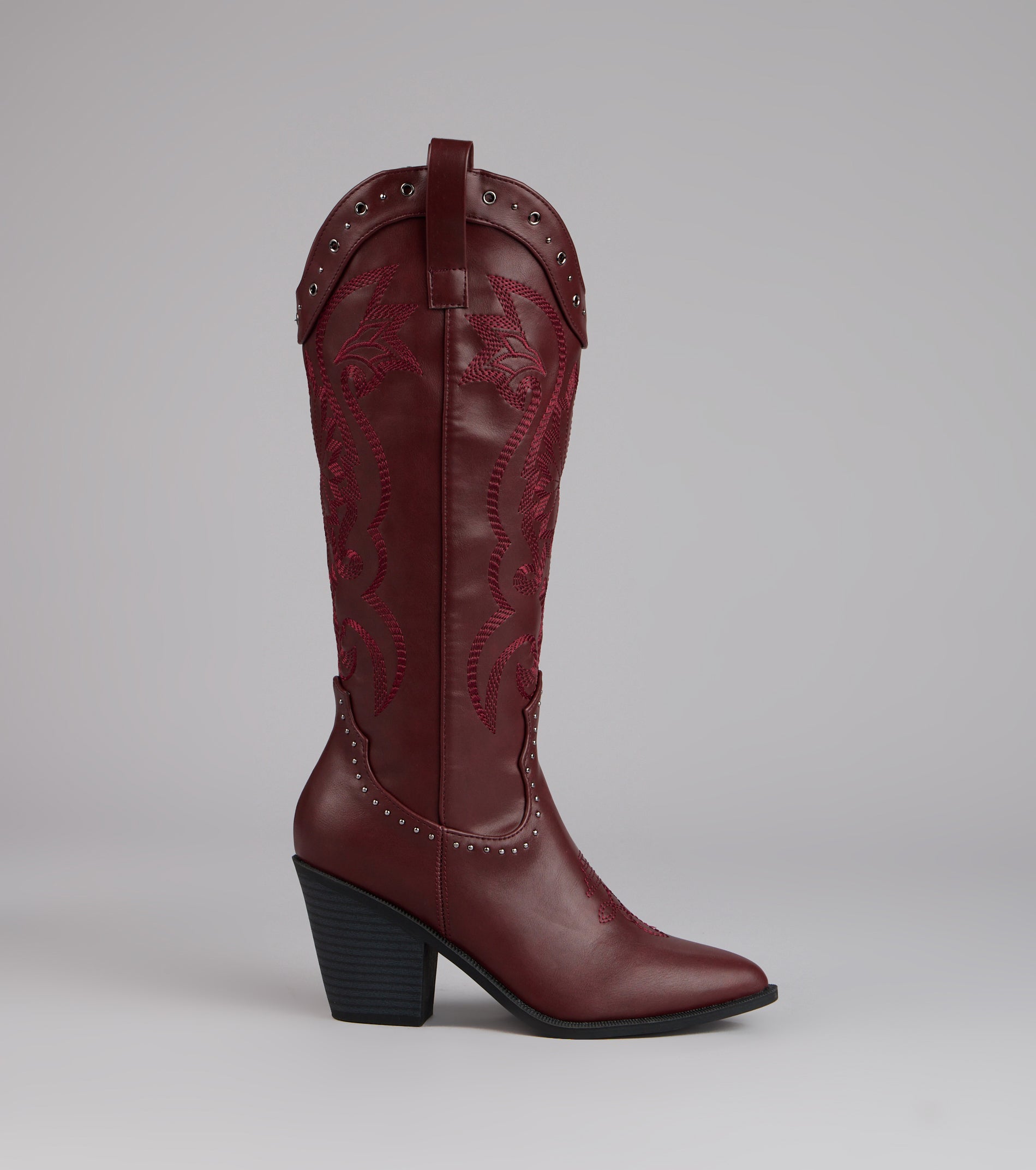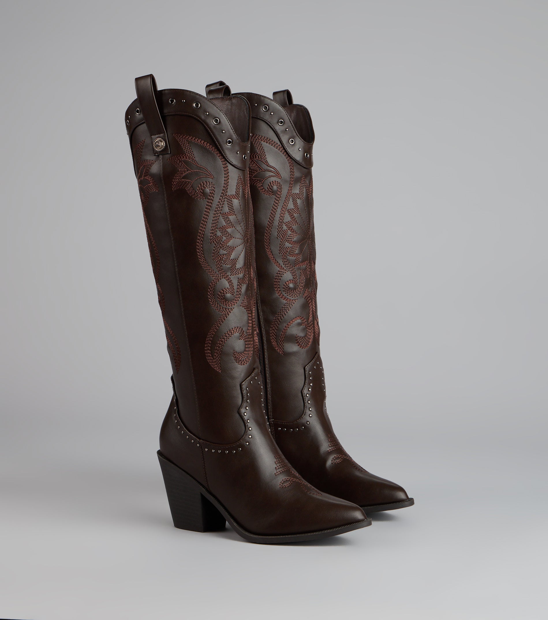 Western. but make it glam. These faux leather cowboy boots mix classic embroidery with studded detailing and a sleek pointed toe—perfect for bachelorettes. country concerts. or costume parties.