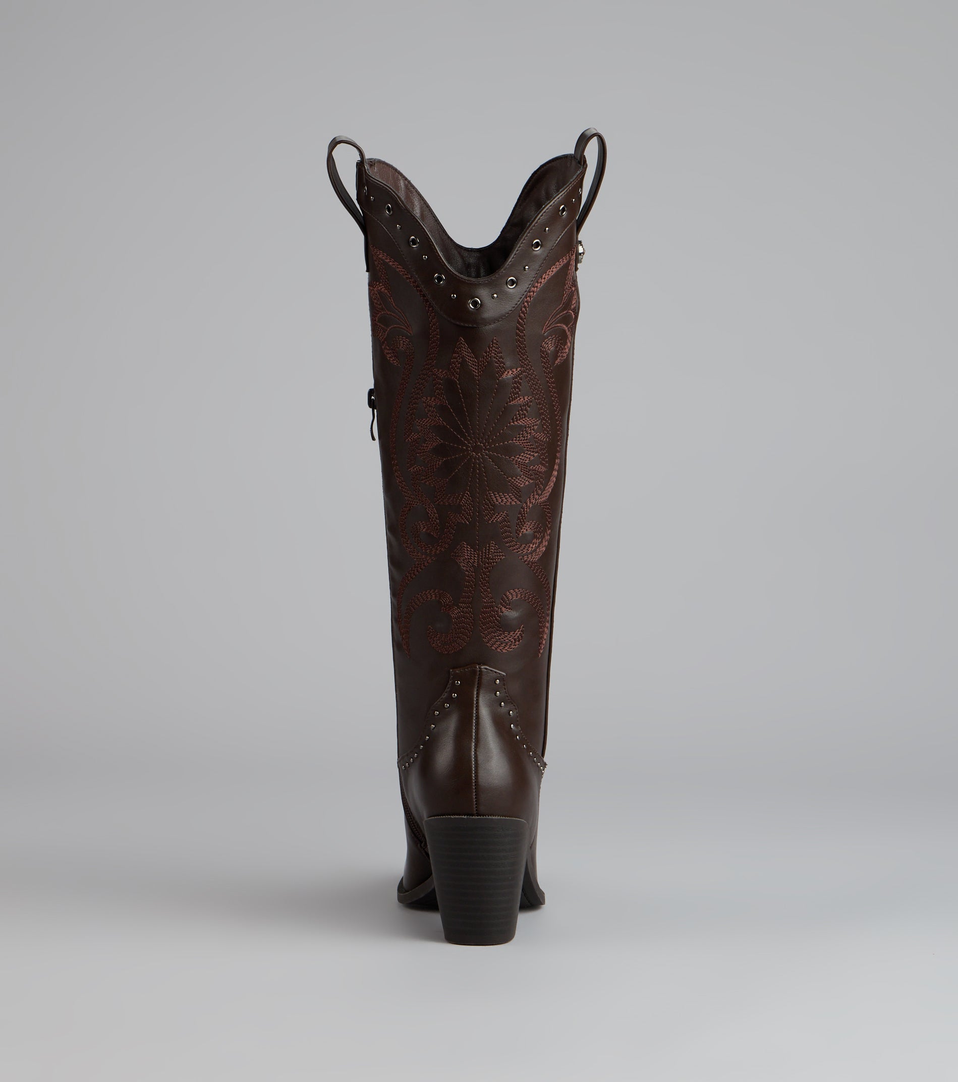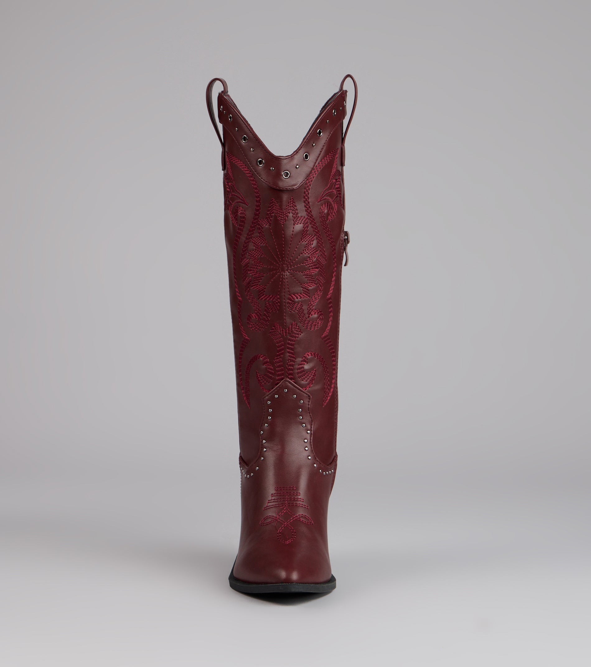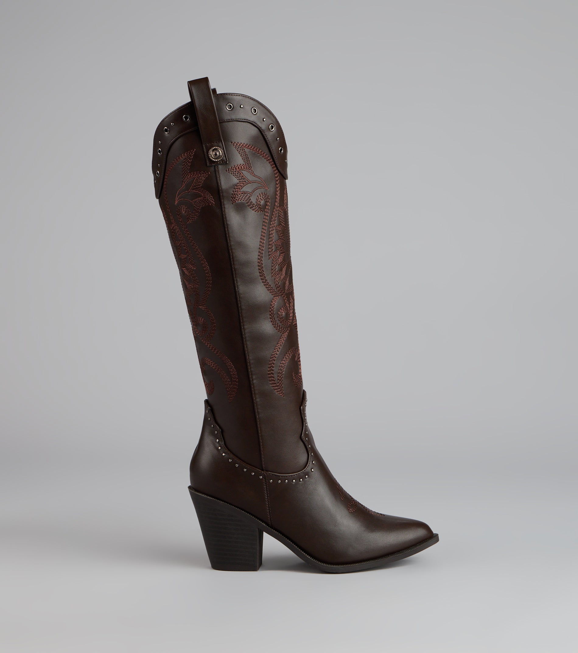 Western. but make it glam. These faux leather cowboy boots mix classic embroidery with studded detailing and a sleek pointed toe—perfect for bachelorettes. country concerts. or costume parties.