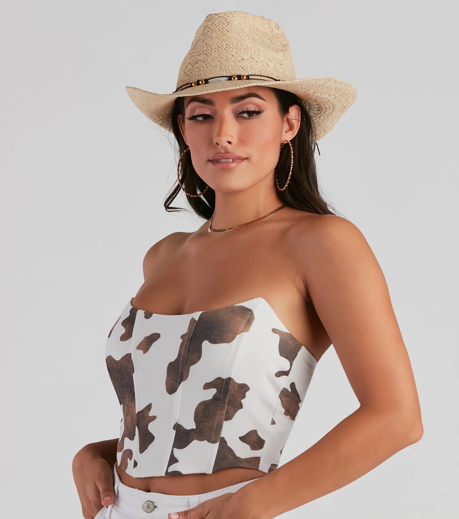 Flaunt your cowgirl digs in this cow print bustier featuring a strapless neckline. flexible boning. and a cropped hem. Complete your rodeo look with a straw and shorts.
