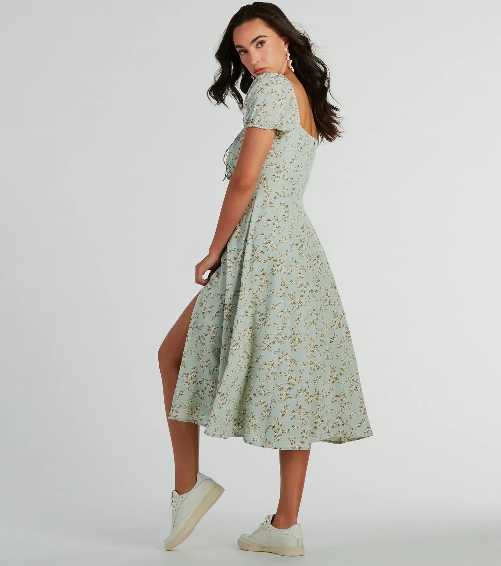 RSVP yes to shower or birthday invites when you have this cute ditsy wildflower tie A-line midi dress in your closet! Embellished with a ditsy wildflower print. this midi-length dress is sure to turn heads. With short puff sleeves and a square neckline. this dress is perfect for casual-dressy occasions. The tie front bust adds a touch of whimsy while the a-line silhouette and front slit provide movement and a flattering look. Complete the look with luxe and tennis shoes.