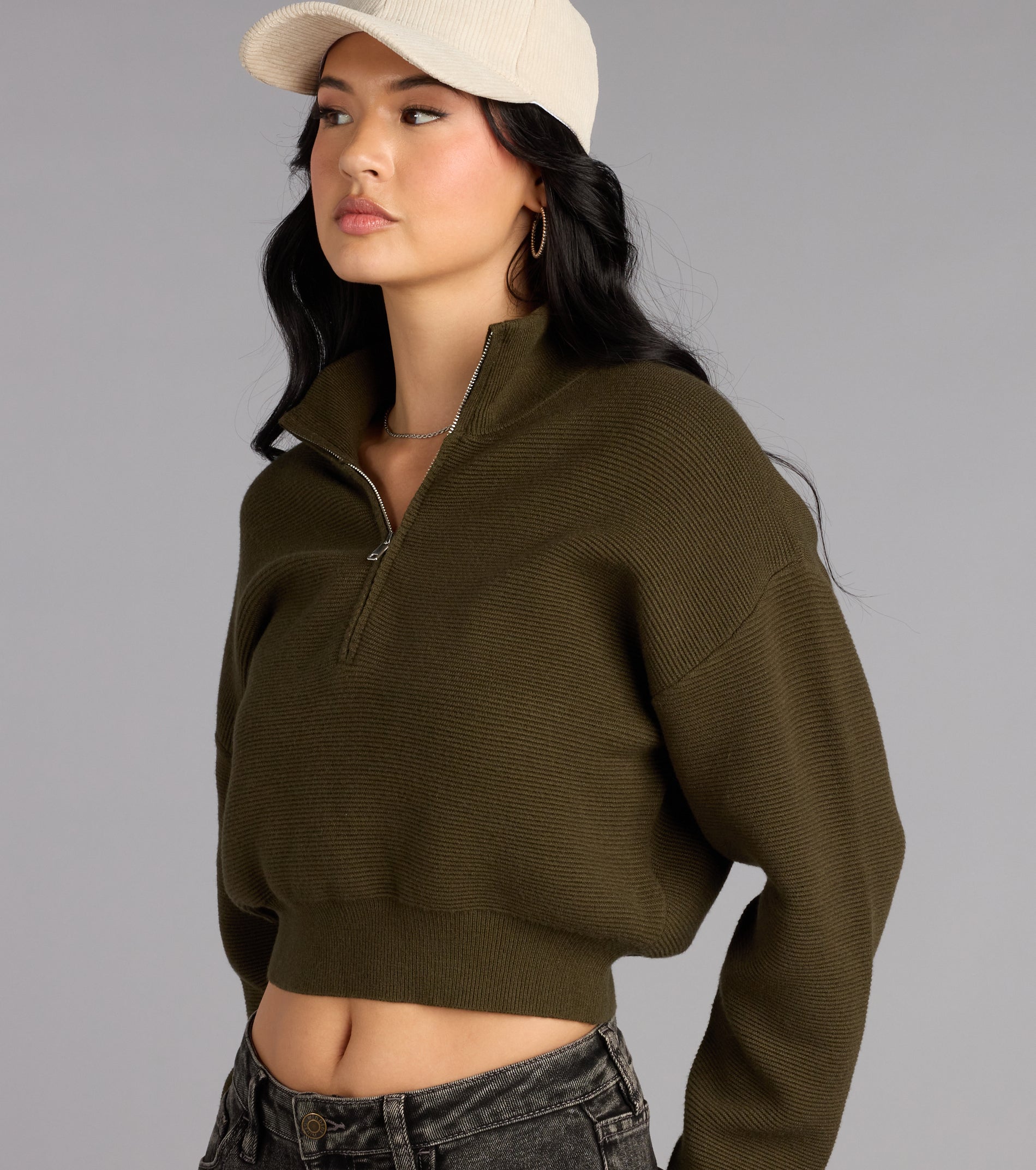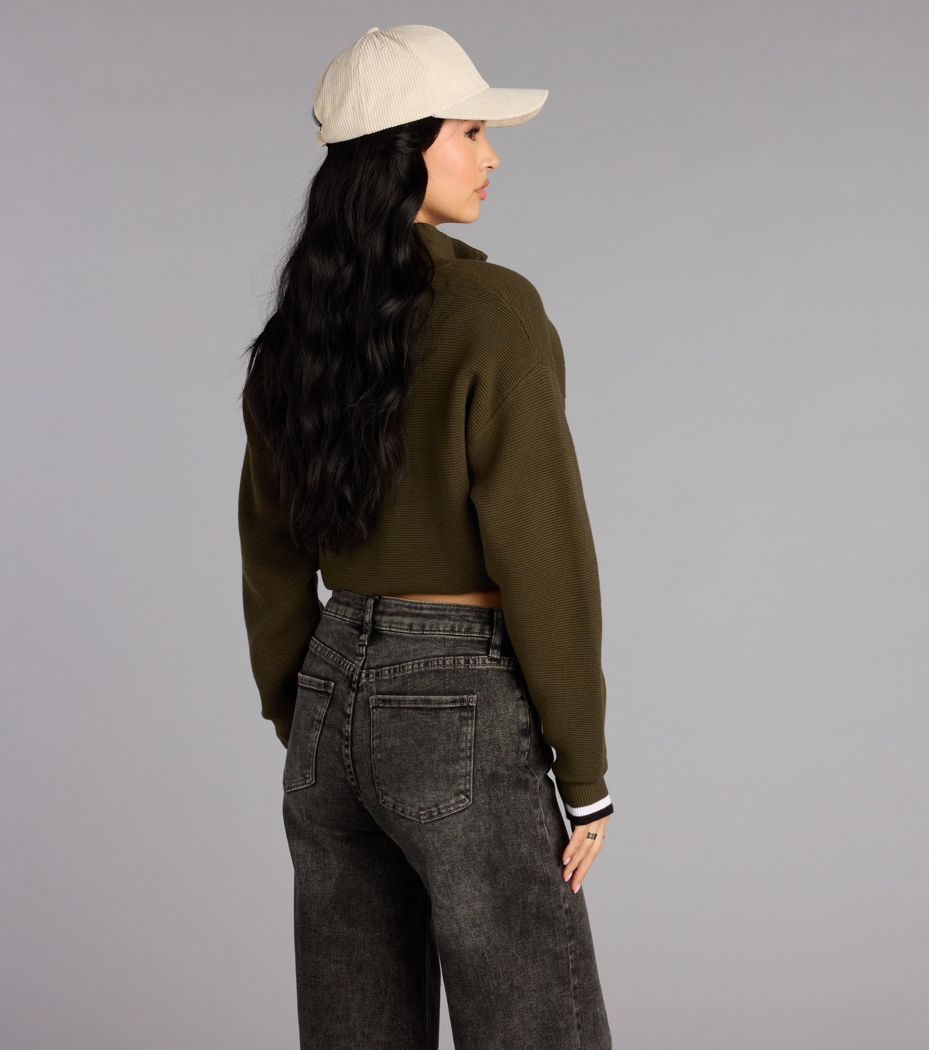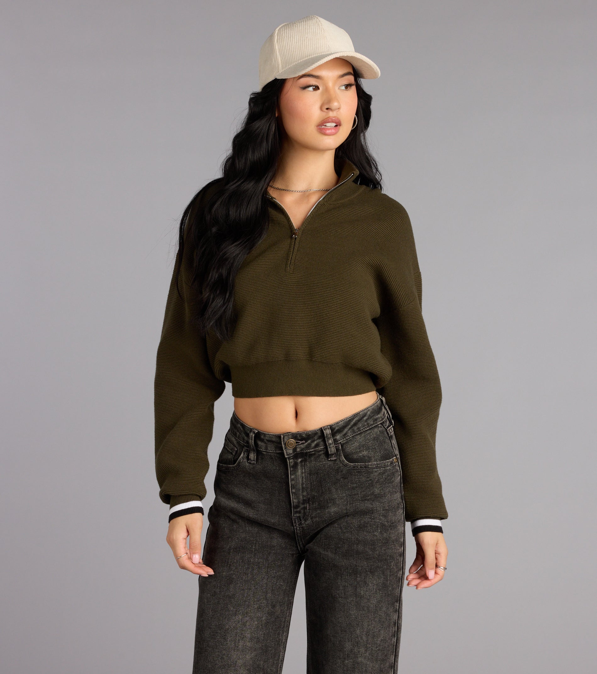 Soft knit. sporty stripes. and a cropped hem—this zip-up sweater makes autumn layering a breeze. Pair with denim and booties for crisp strolls. latte runs. or any fall plans.