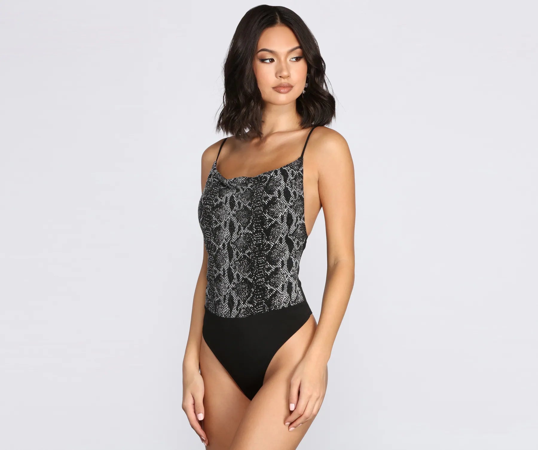 Stylish and seductive. this snake print bodysuit is oh so alluring!