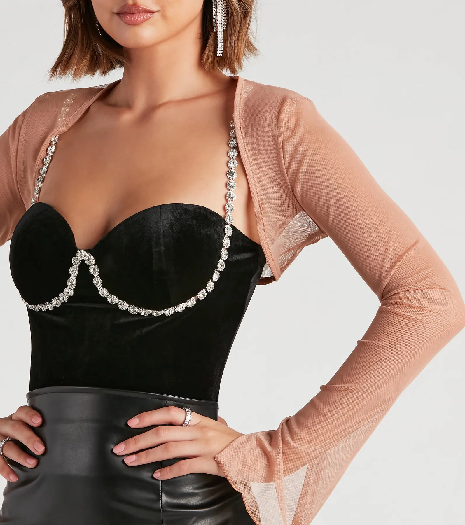 Layer on the chic elegance in this mesh bolero top designed to elevate your everyday looks to formal ensembles. The sheer long sleeves perfectly cover your arms with a touch of sophistication. while the cropped silhouette is the ideal layering piece that won’t take away from a stunning formal or .