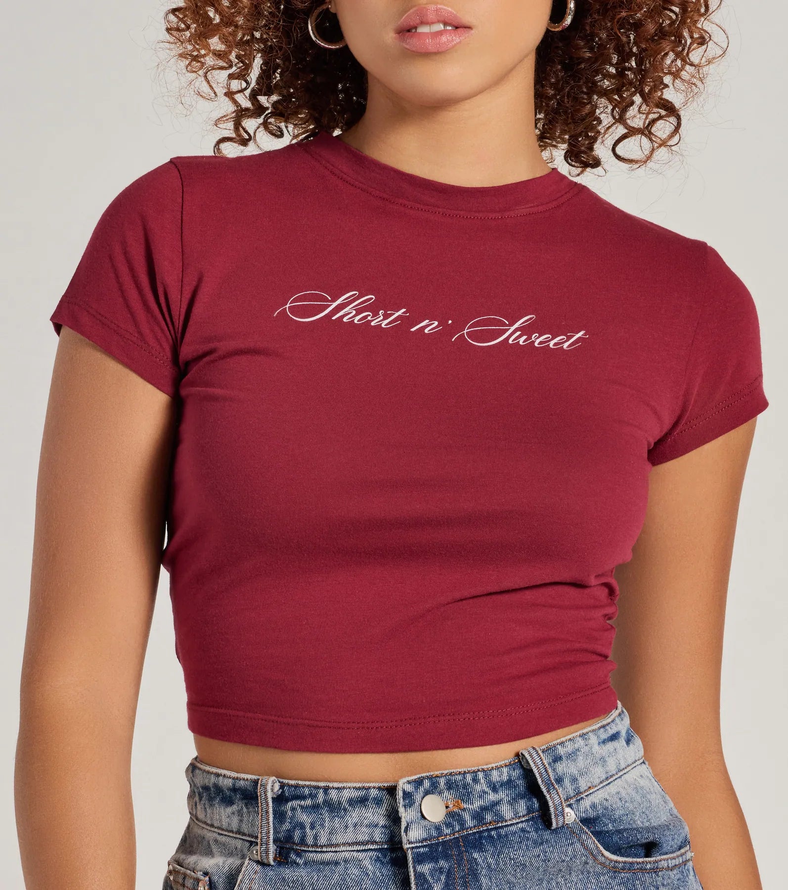 Show off your love for your fave pop star in this adorable graphic tee featuring a crew neckline. short sleeves. a cursive script reading Short n’ Sweet. and a fitted cropped hem. Style with jeans for a casual vibe. or a mini skirt and boots for that chic look!