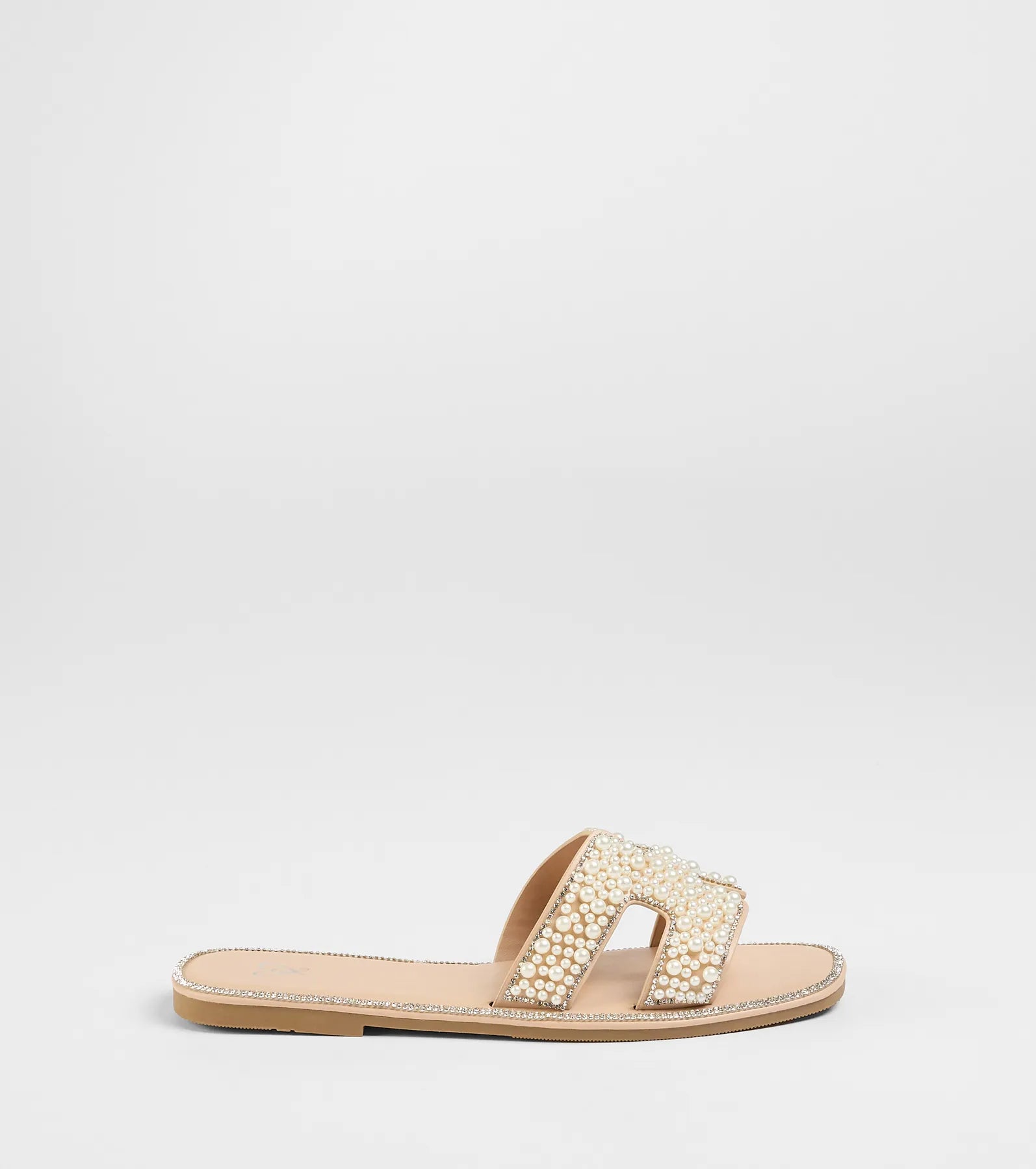 Elevate your footwear with these flat sandals featuring a dazzling rhinestone embellished trim and cutout band with lovely faux pearl embellishments. Pair with a hair accessory for a bridal shower or dressy occasion!