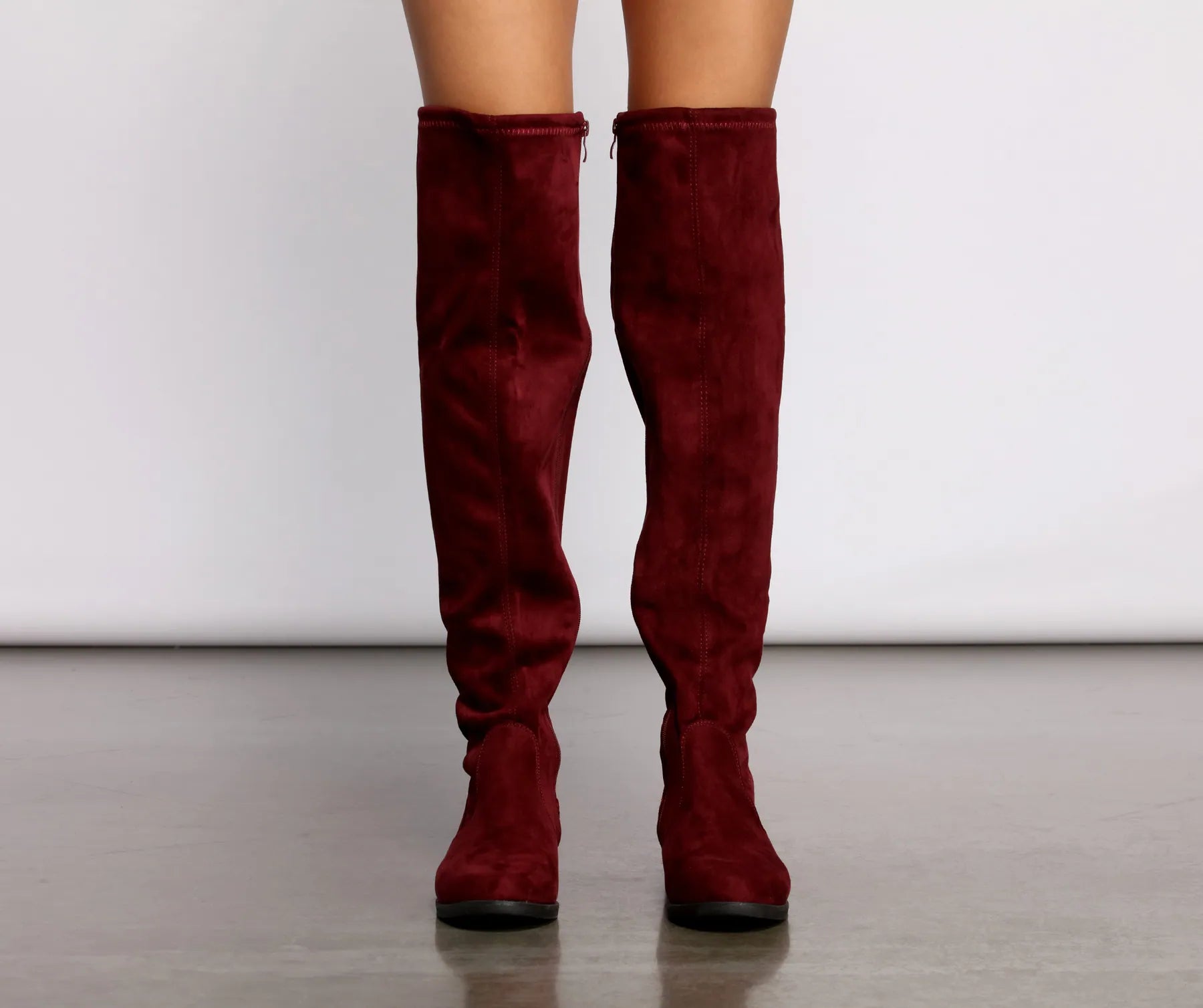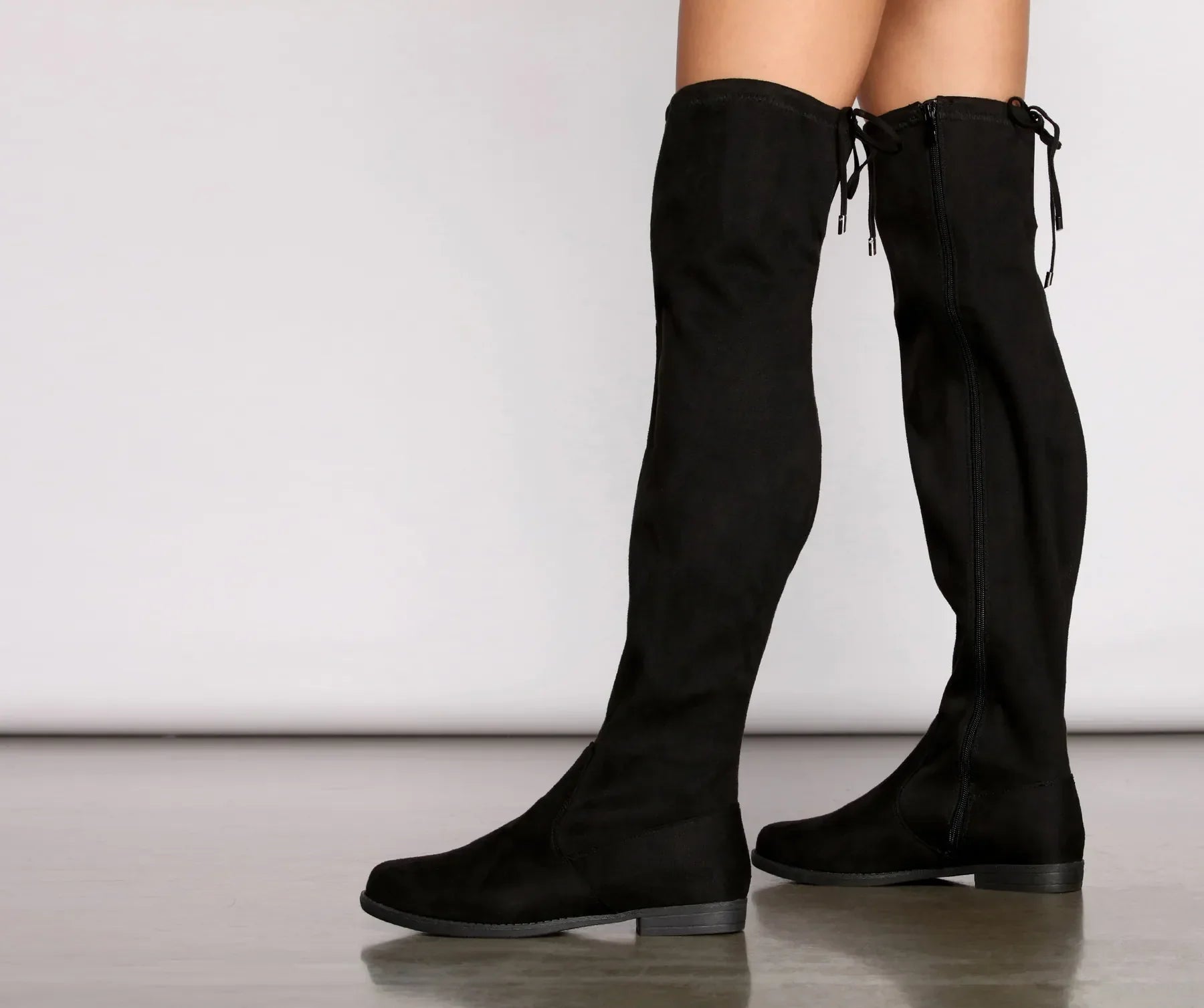 Get a simple yet very stylish look in these flat over the knee boots! They feature an over the knee design with a trendy tie back detail and smooth faux suede material. Pair these fall-ready boots with a for a cute date night look.