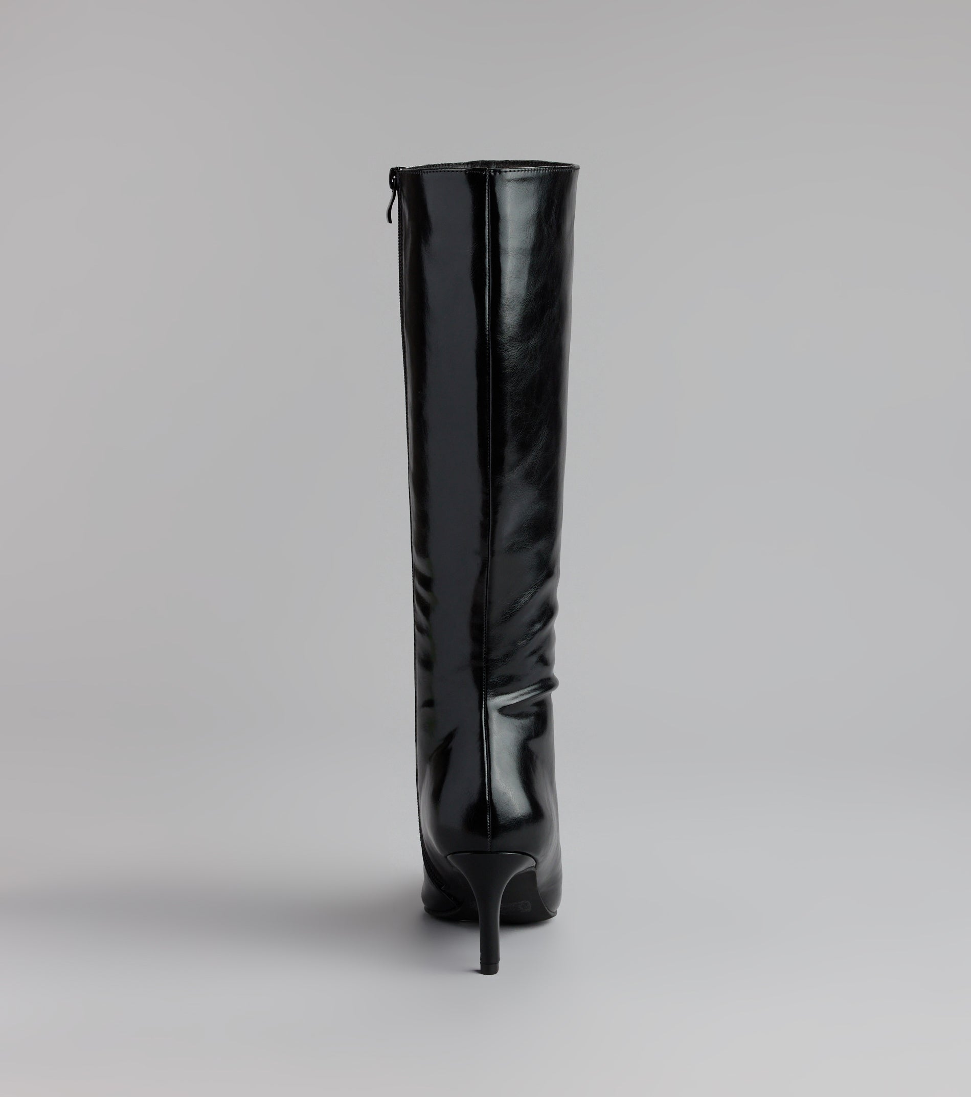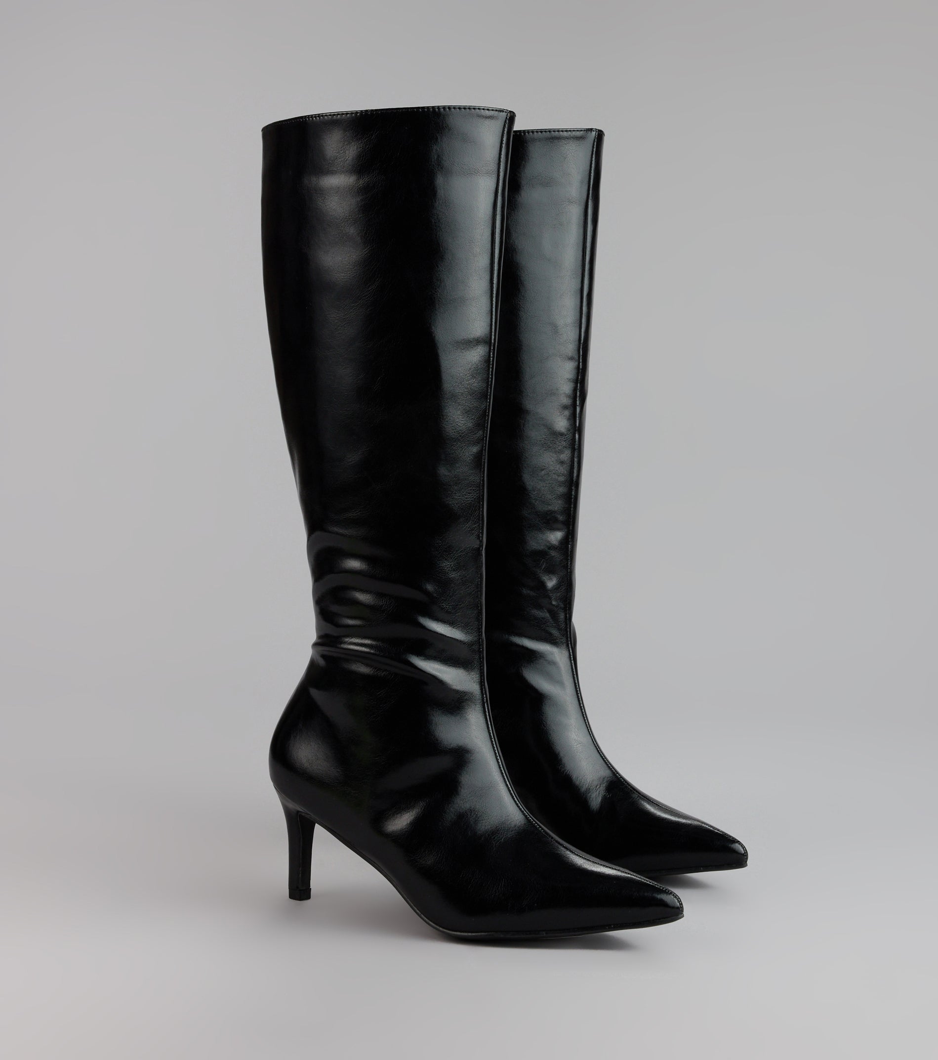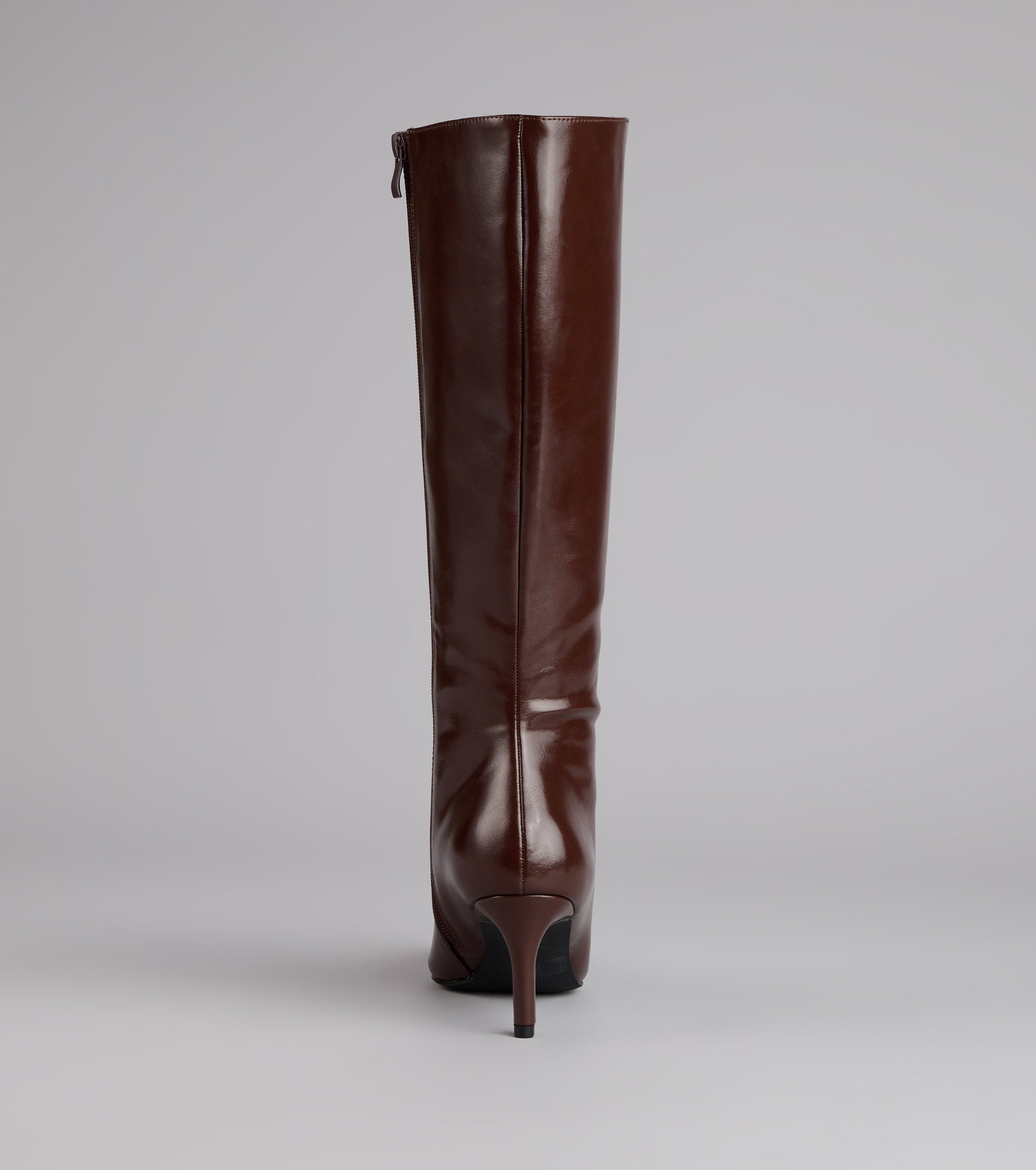 Cold-weather dressing just got elevated. These faux leather boots bring timeless polish with a pointed toe and sleek under-the-knee cut. with a stiletto heel that pairs effortlessly with fall layers.