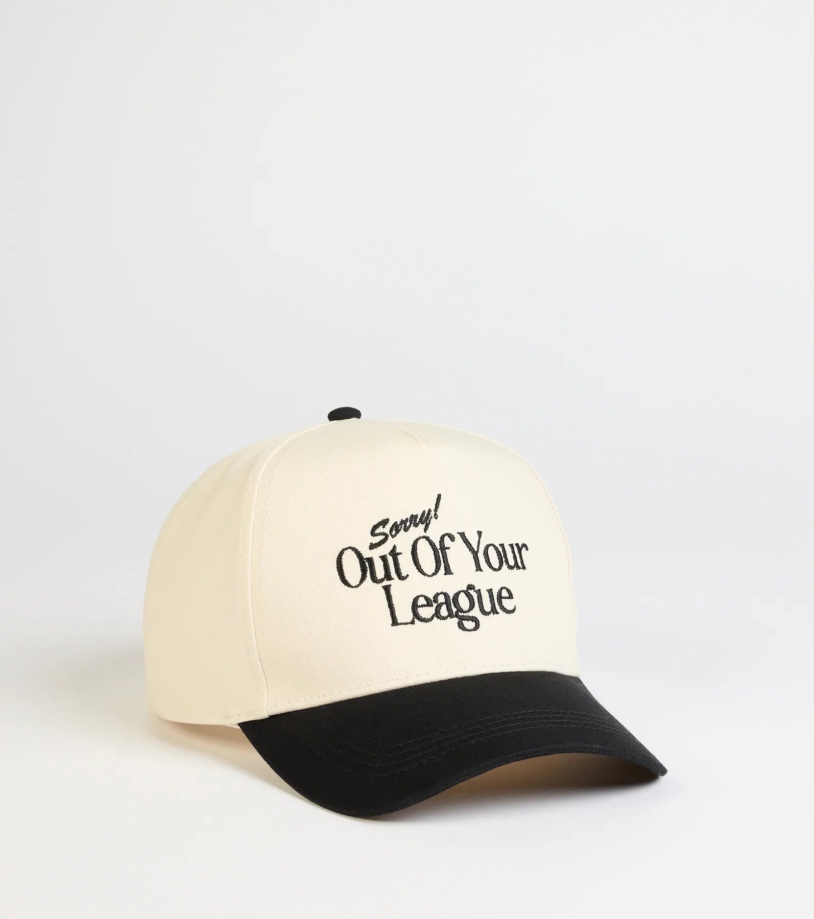 Flaunt your attitude in this baseball cap featuring ‘Sorry Out Of Your League embroidered script and a trendy two-tone design. Pair with a crop top and jeans.