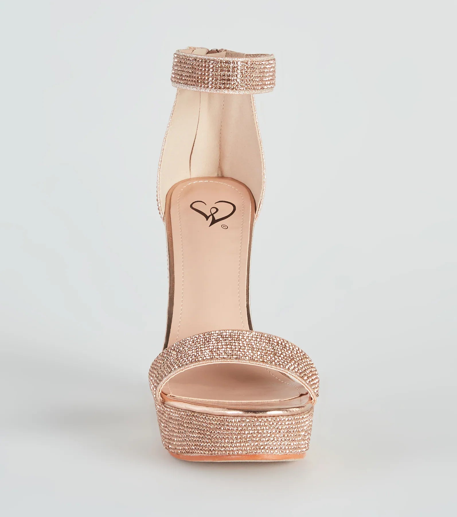 Elevate the shine and sparkle in these rhinestone block heels! These sparkly platform heels feature an open-toe design with a stylish ankle strap that goes with a closed-back zipper closure on a wide block heel. These party-ready heels are the perfect finishing touch with a cocktail dress for a wedding or a sexy club outfit for a GNO. Complement your rhinestone heels with matching for a post-worthy look.