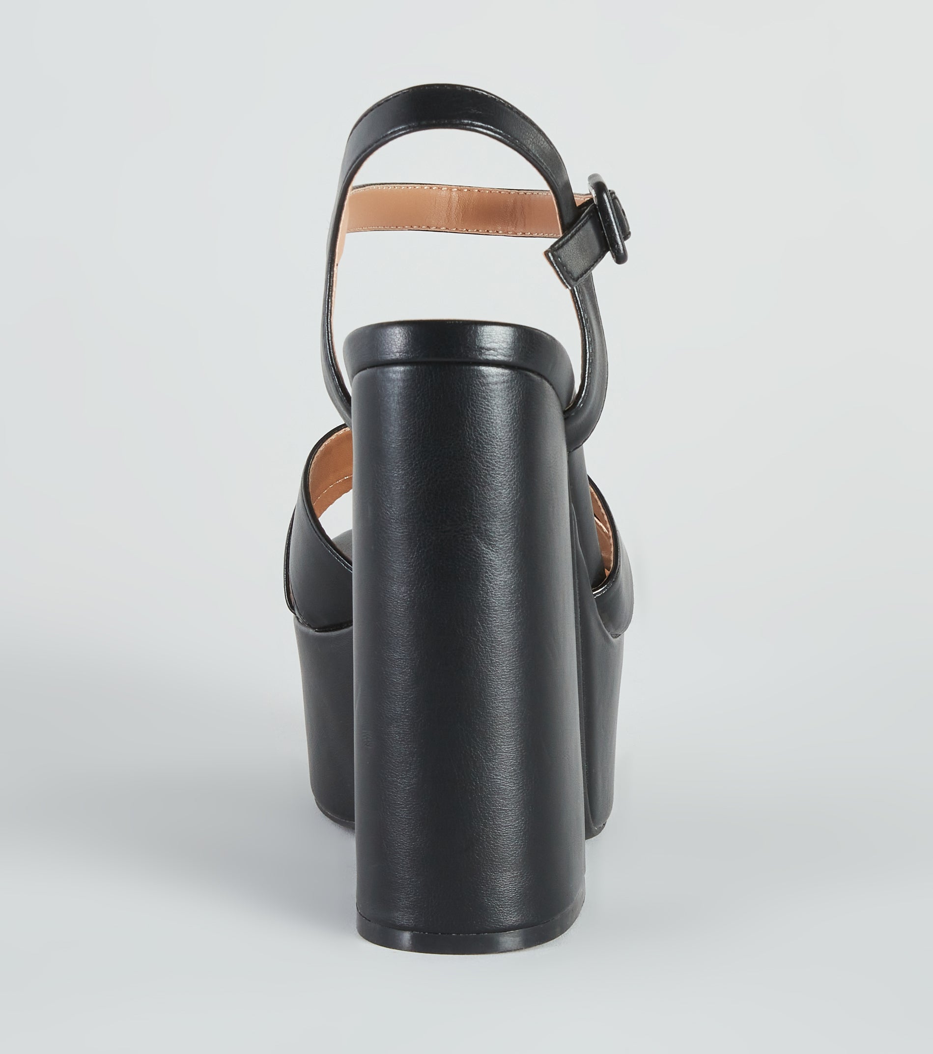 These sleek faux leather platform block heels will have you strutting in style your next night out. They feature an open almond-shaped toe. criss-cross toe straps. a thin adjustable ankle strap. a chunky platform sole. and an ultra-tall block heel for all the drama. Pair with a !
