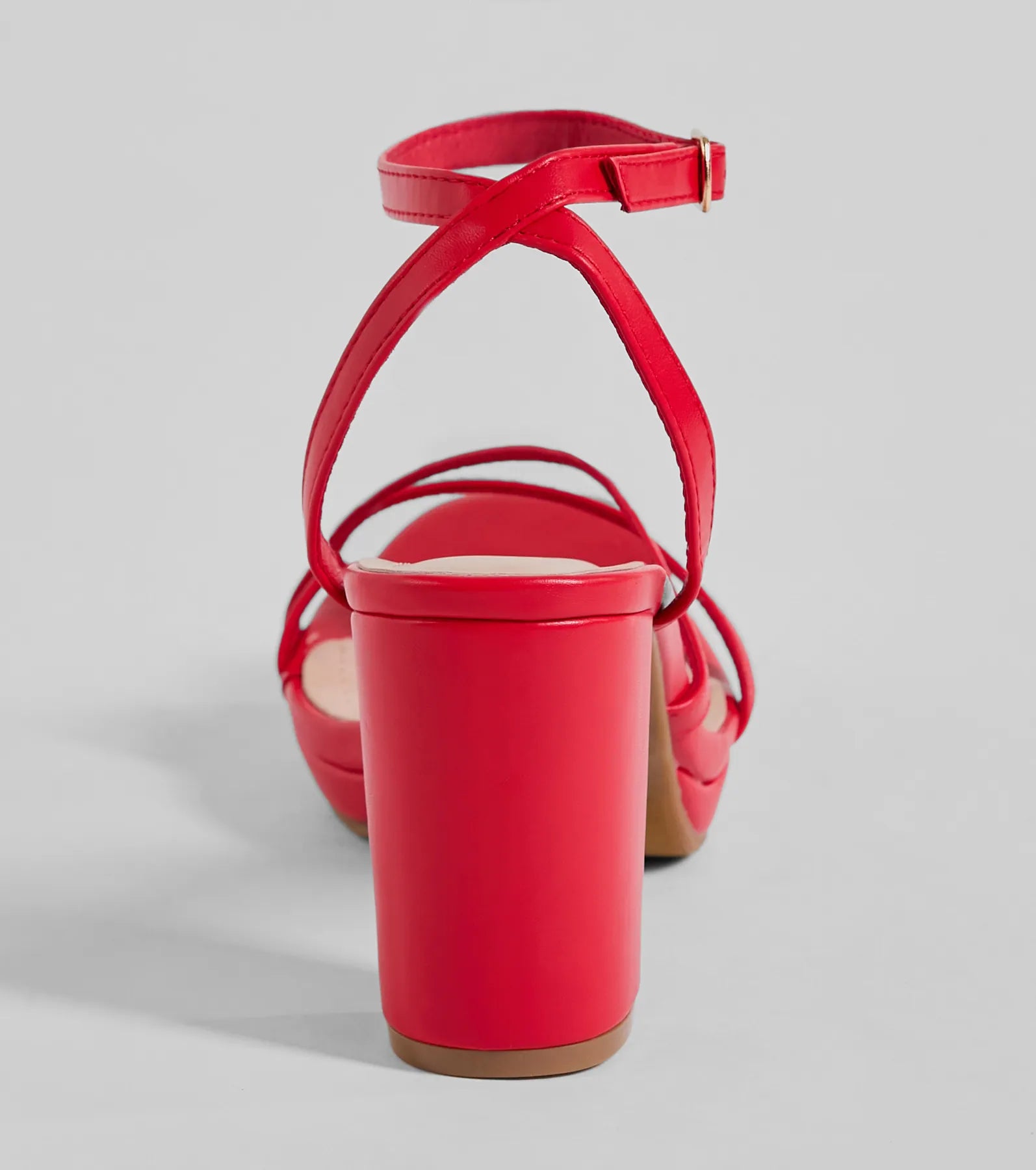 Show off a stylish slay on your next night out in these faux leather platform block heels! They feature an open square-shaped toe. asymmetric straps across the foot. thin adjustable ankle and heel straps with a buckle closure. a platform sole. and a block heel. Pair with a sleek .