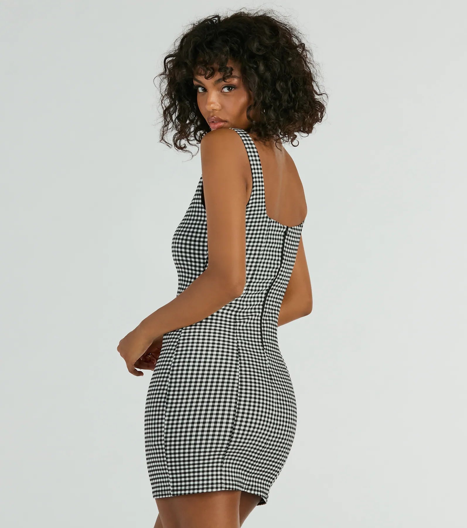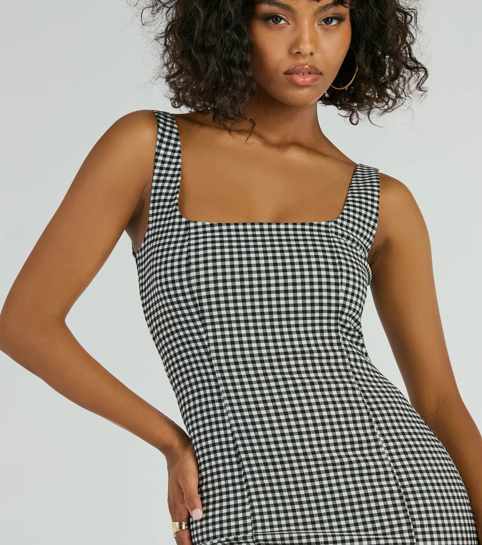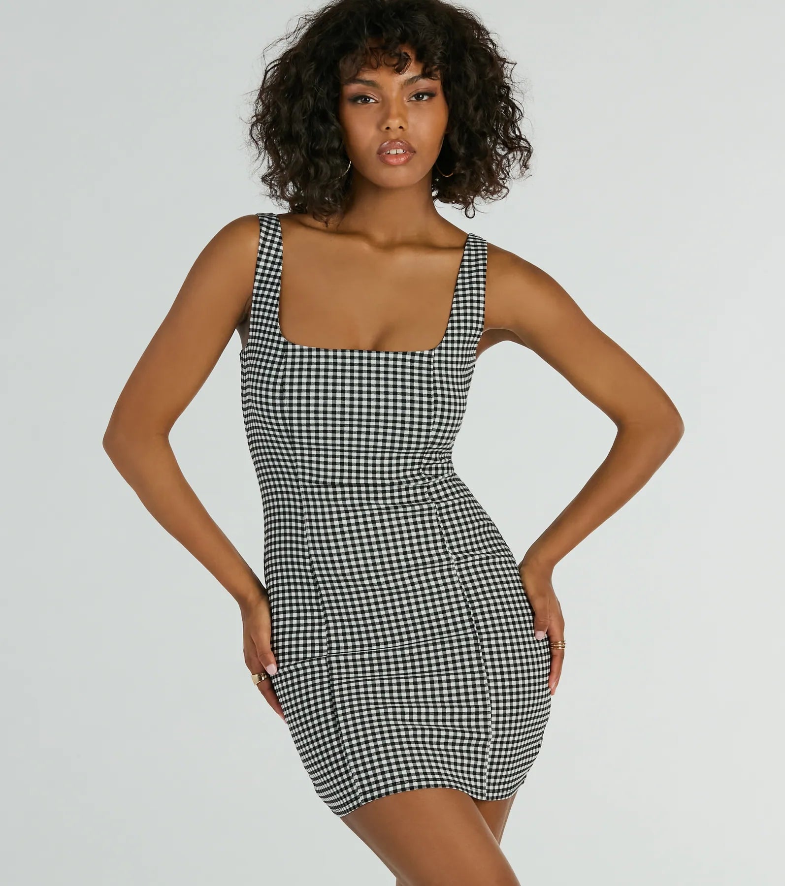 So on trend and sweeter than pie. this gingham mini dress is essential for spring-to-summer fun! This mini-length dress is made from woven fabric and features a charming gingham print that exudes effortless style. The scoop neckline and tank shoulder straps flatter your figure. while the form-hugging fit accentuates your curves. Complete the look in cute and a mini purse!