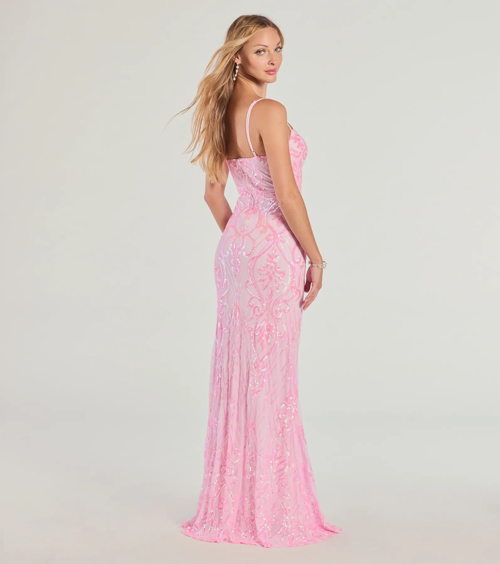 Make a shimmering arrival in the Tabitha sequin formal dress at celebrations and red-carpet events! The floor-length dress is designed in a fitted column silhouette with a high front slit for movement.