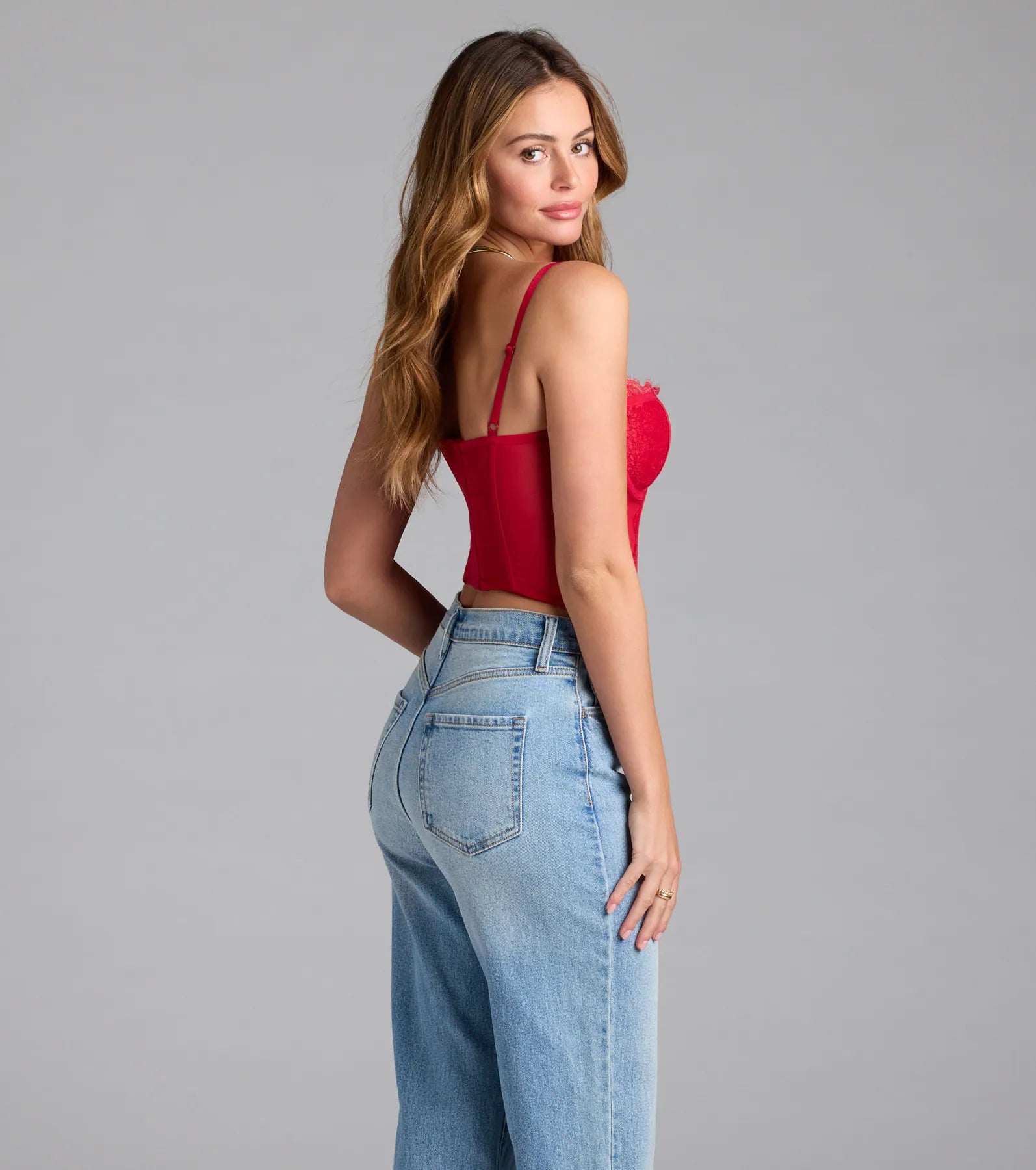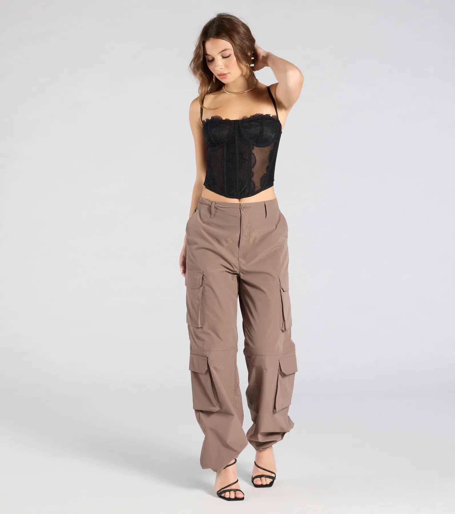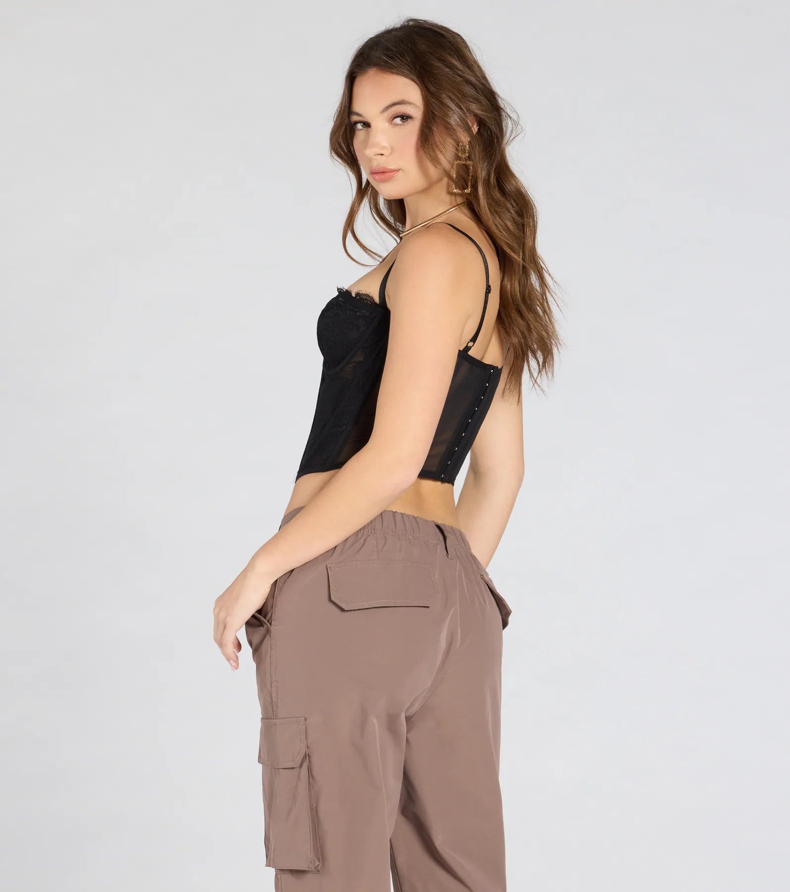 Deliver total bombshell vibes in this lace corset top for a date or girl’s night! This sleeveless corset is made to stun and boasts a flattering square neckline and sheer mesh sides to show skin along the sleek cropped hem. Pair with cargo pants.