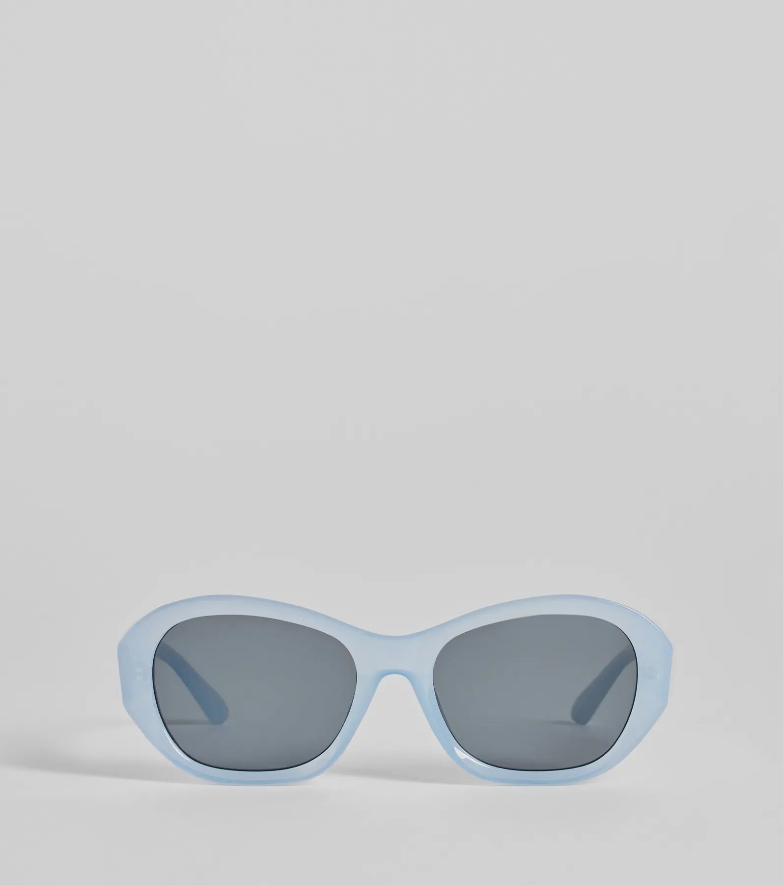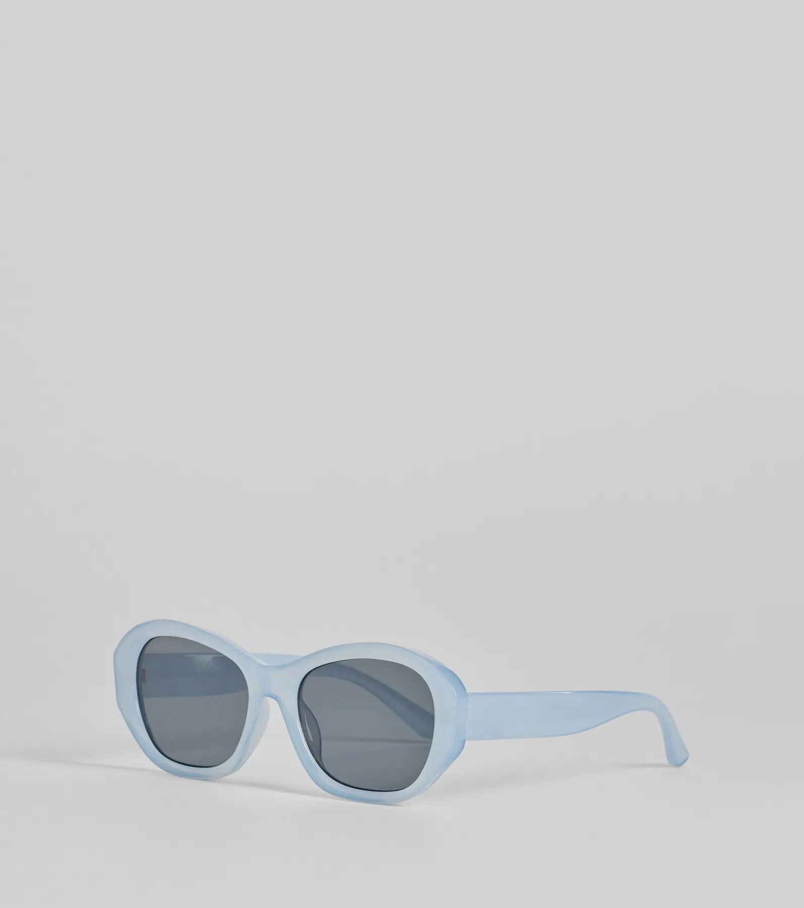 Level up the trend factor of your summer looks with these cool shades. The sunglasses feature an angled oval-shaped design with a translucent plastic frame. built-in nose pads. and tinted lenses. Pair with a and sneakers.