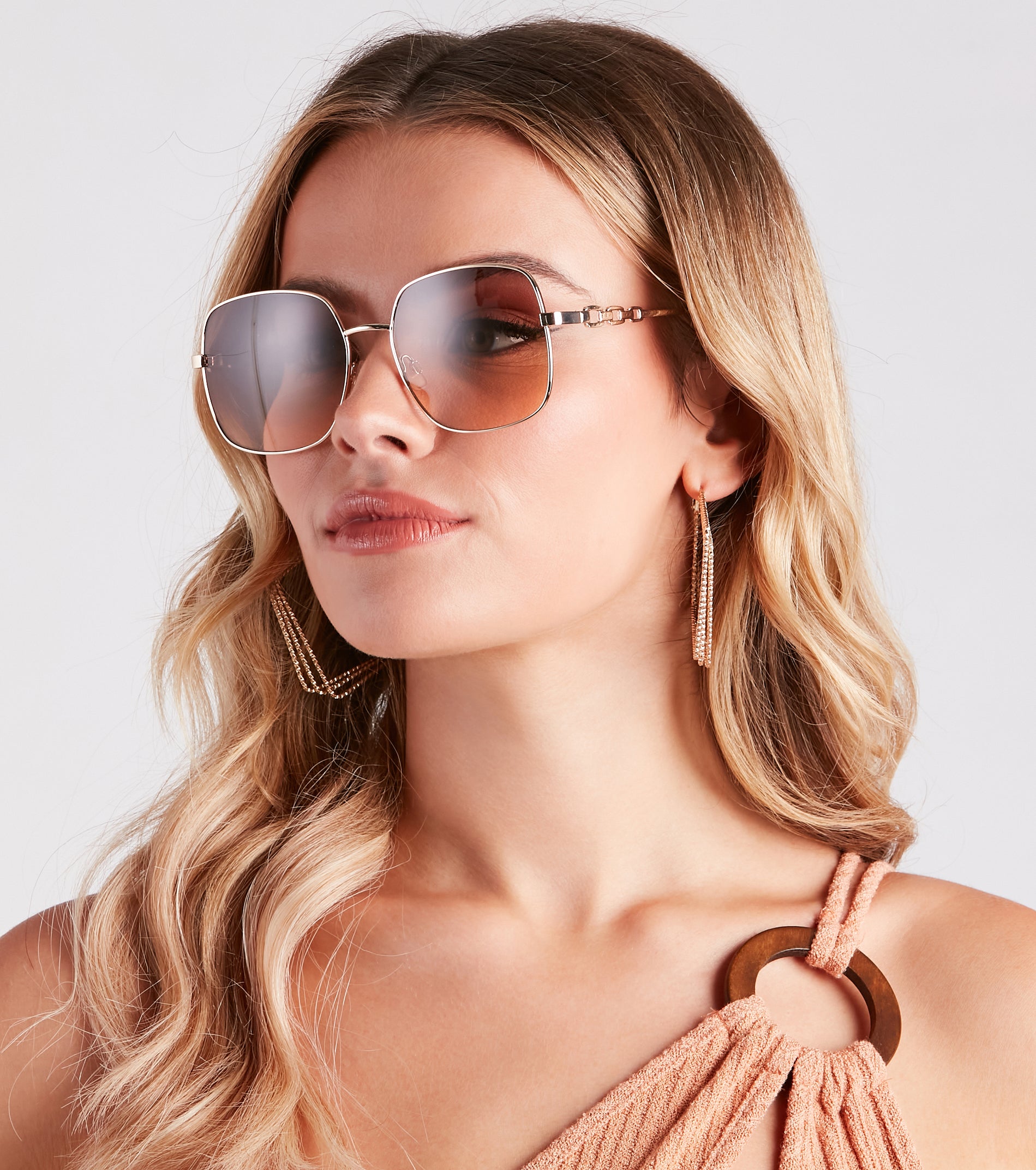 Show off those trendsetting vibes with these sleek shades! They feature a glam oversized design with a curved square shape. a thin metal frame. chain-link accents on the arms. rubber nose pads for support. and tinted lenses with a cool smokey brown hue. Style with .