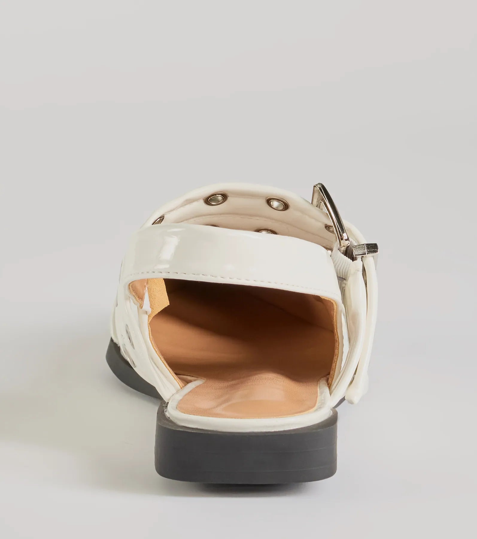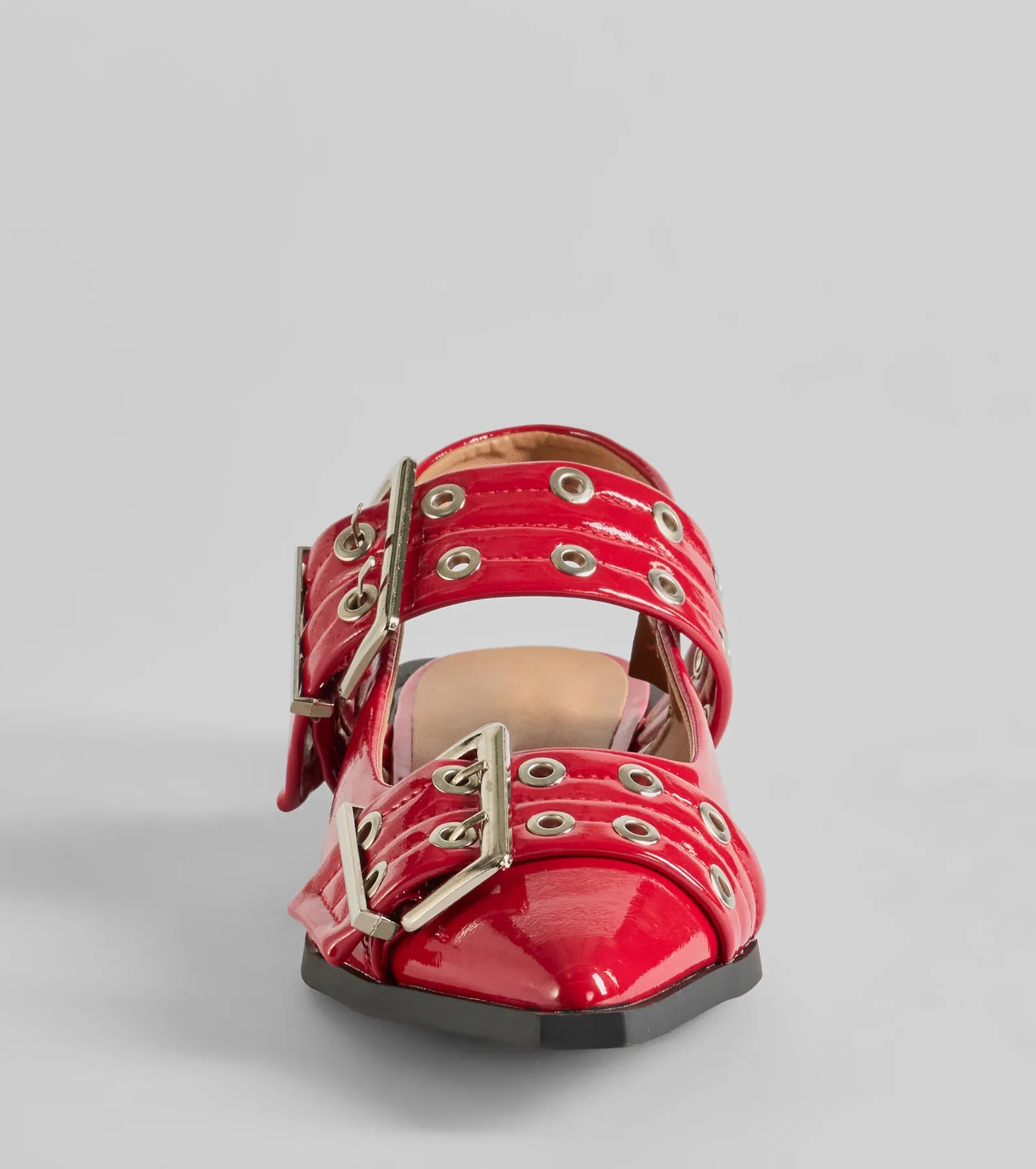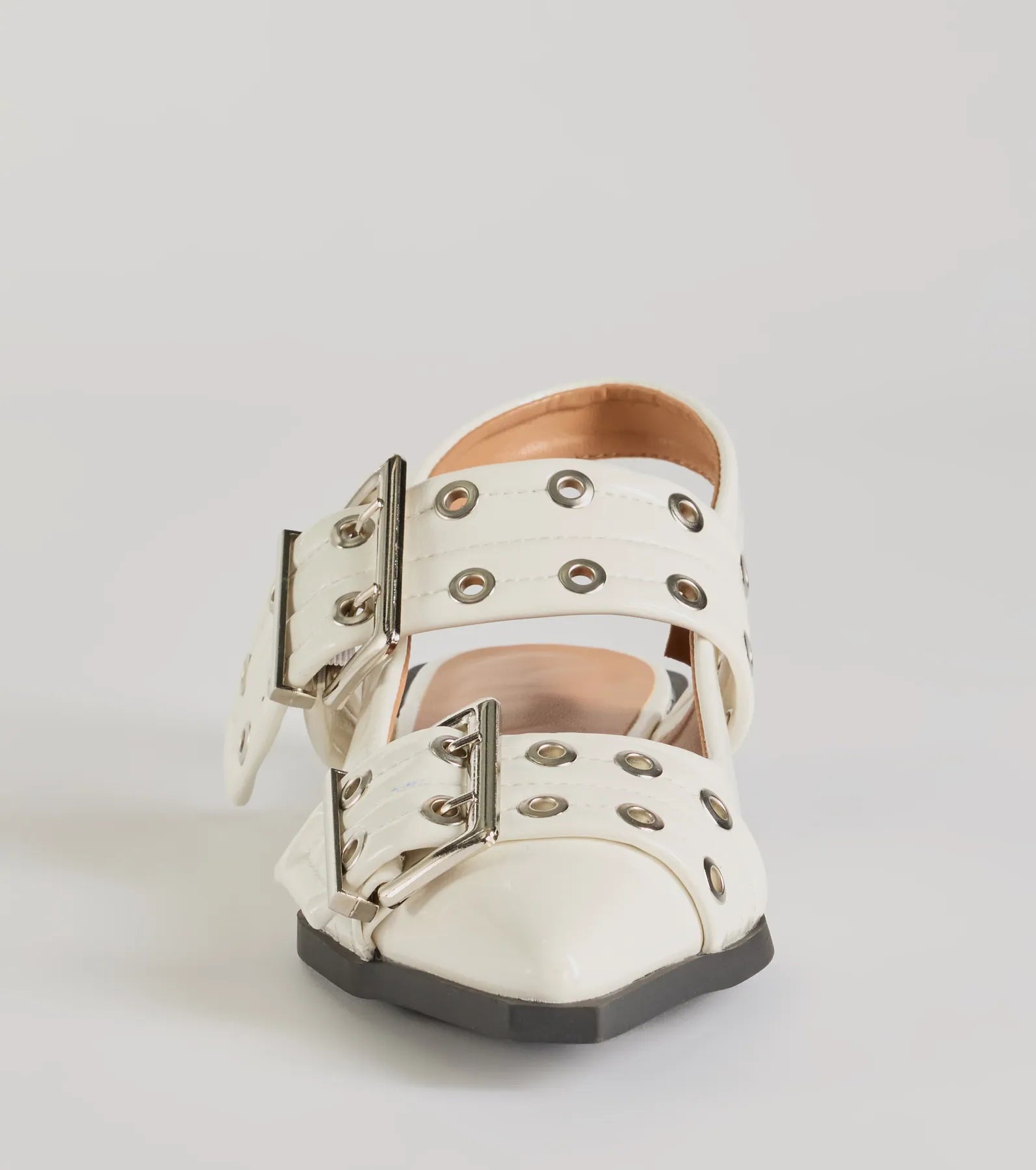 On the go? Slip on these faux leather flats for a trendy look that’s always effortless! They feature a closed pointed toe. dual grommet buckle accent straps for an edgy flair. and an open ankle with a strap. Complete the look with for any plans!