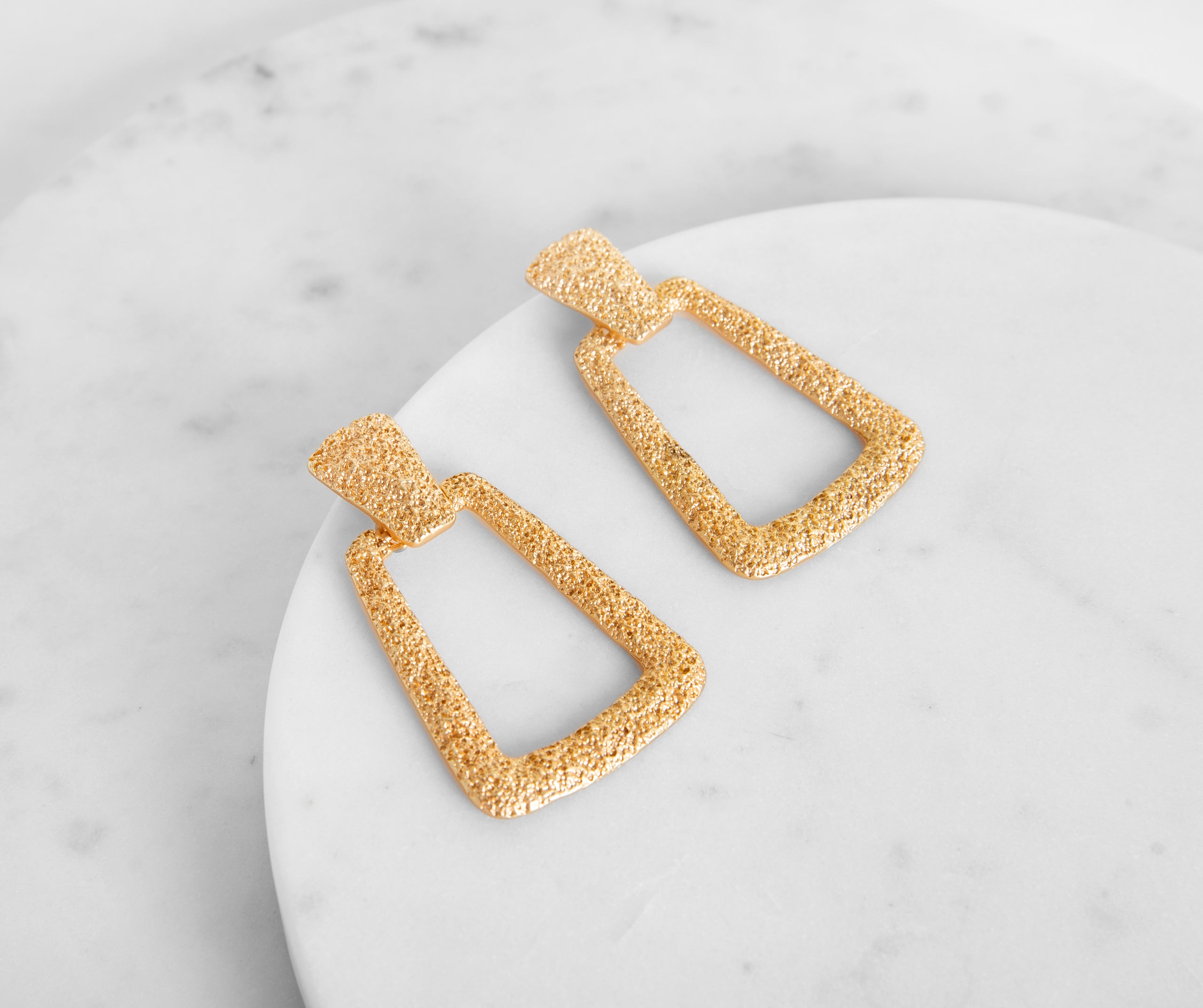 These trendy textured earrings will totally level up your look. They feature a door knocker style with a rectangular shape with a cool. textured look. They include post back closures.