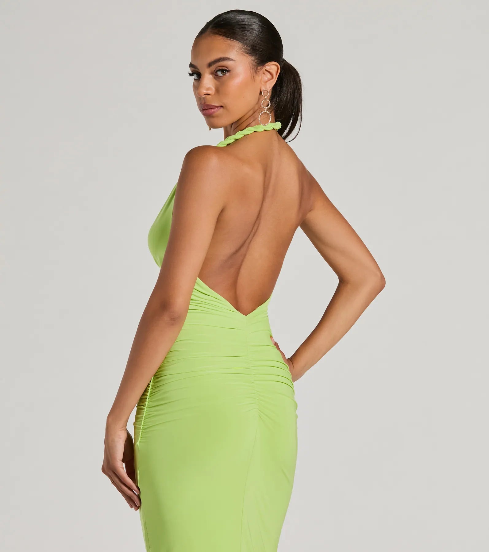 Versatility at its finest. this sleeveless midi dress knows a trick or two! Crafted from a smooth knit fabric that fits like a glove. this dress offers a convertible neckline with a braided strap allowing for multiple styling options. side ruched seams. and a perfect bodycon fit. Complete the look with dangly and heels for date night or a semi-formal event!