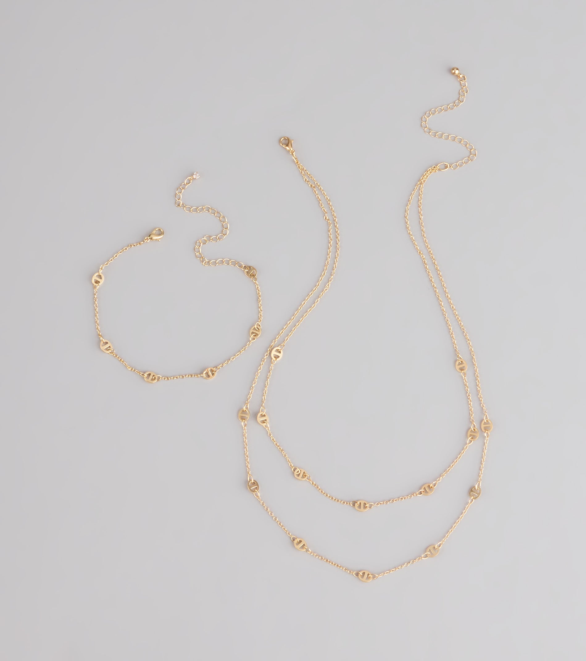 This chain link layered necklace and bracelet set brings effortless edge and polish??perfect for stacking with more or standing out solo.