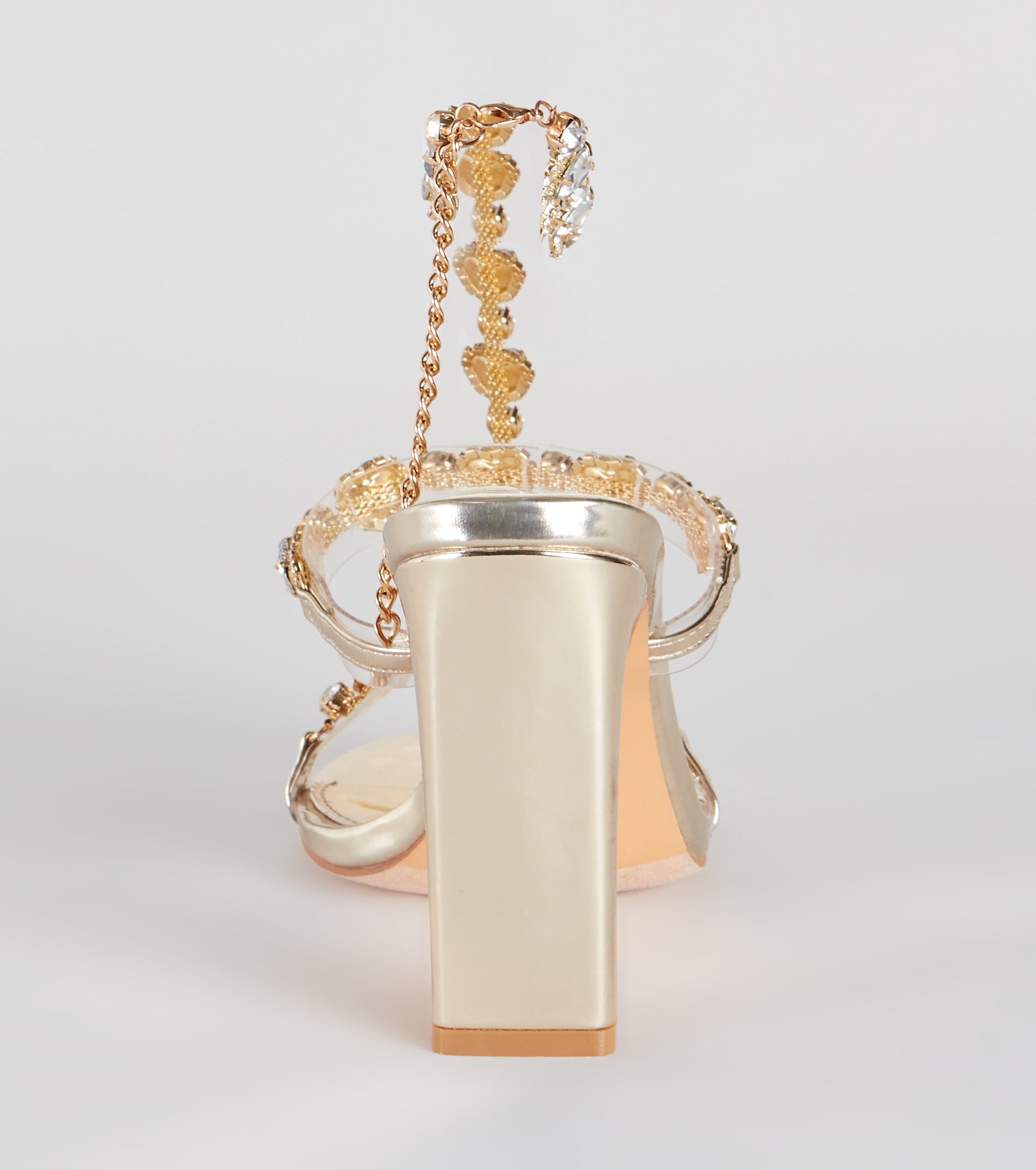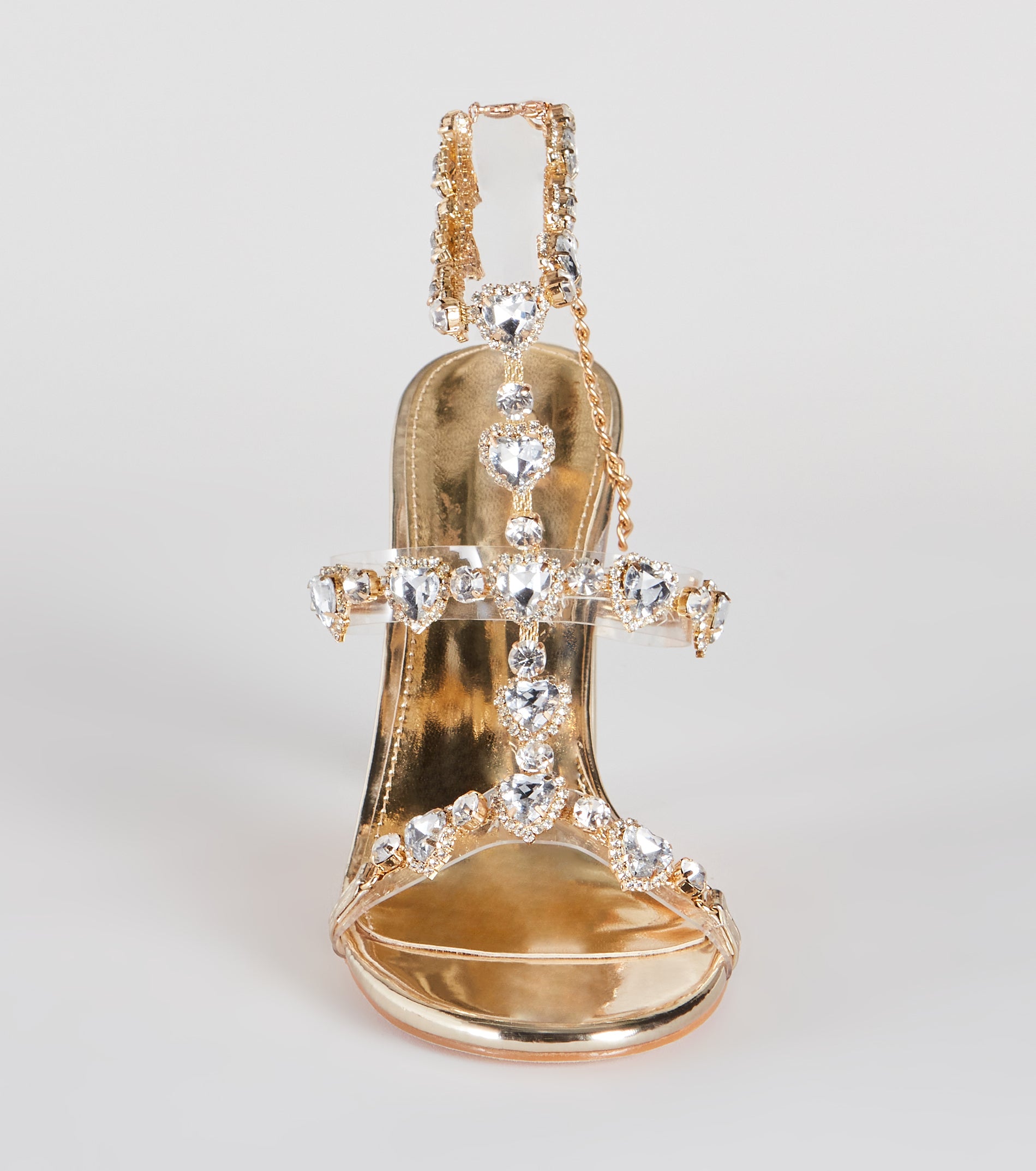 Uncover these beauties for every formal soiree! The heels feature a round toe. thin clear PVC caged straps with statement heart-shaped and round gemstones. a thin block heel. and a gemstone-embellished ankle strap with an adjustable chain and lobster clasp closure. Complete the look with a .