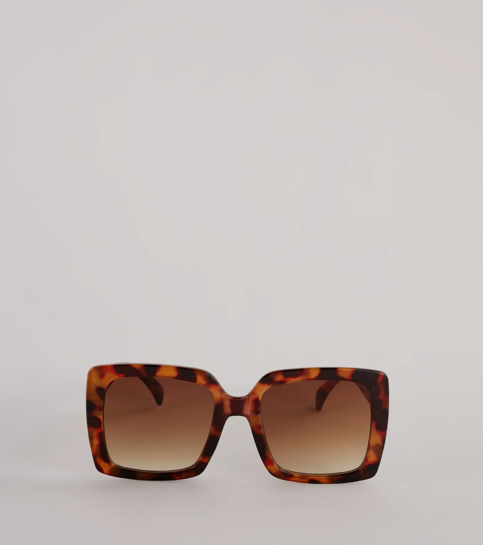 A pair of sunglasses featuring an oversized design. tortoise pattern. tinted lenses with 100% UV protection. and nose supports. Perfect for everyday wear.